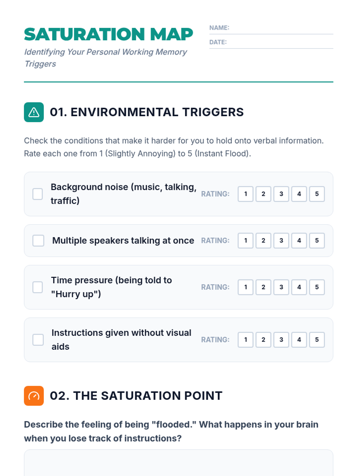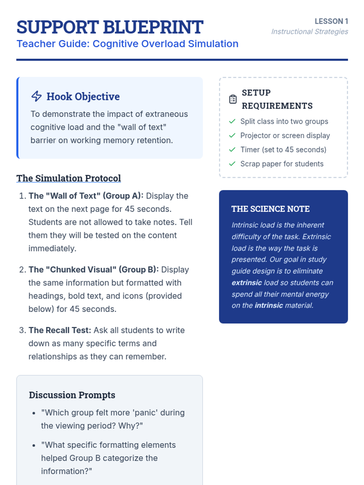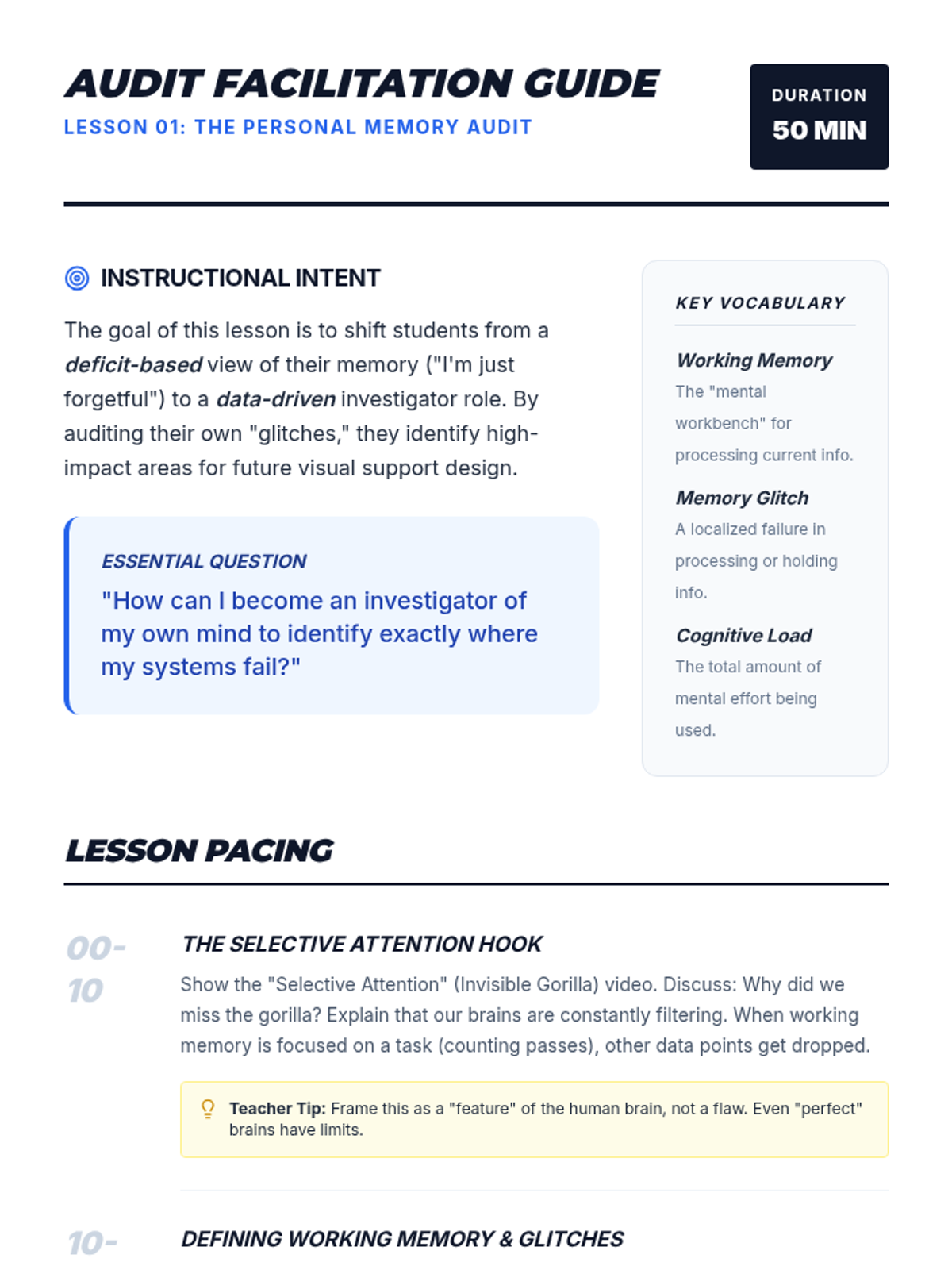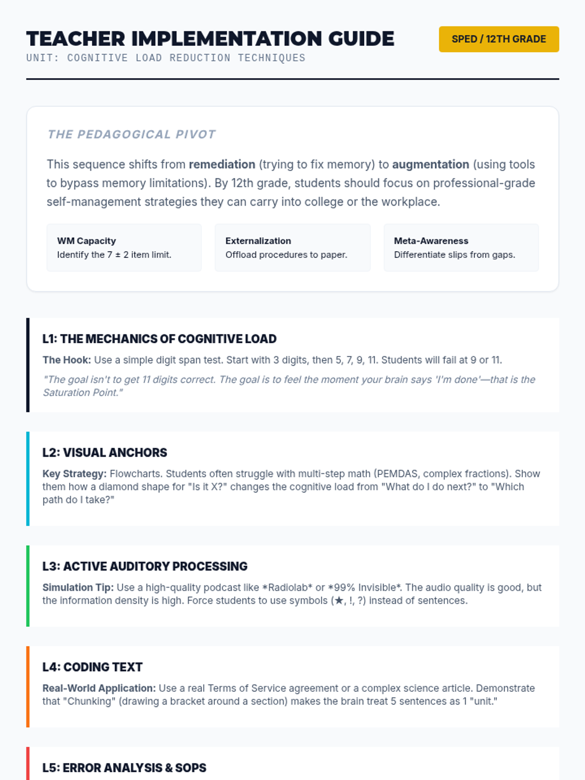 A metacognitive sequence for 11th-grade students to audit their own working memory challenges and design personalized visual support aids. Students transition from passive recipients of support to active designers and advocates for their own learning environments.