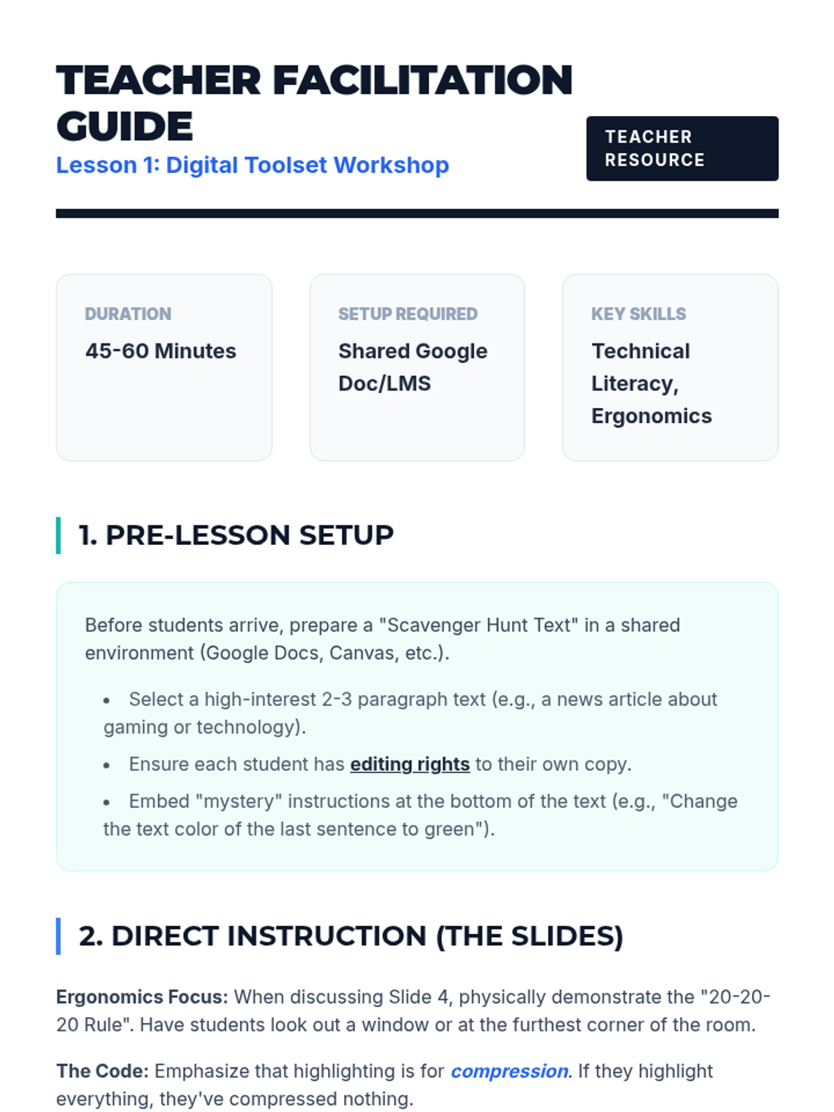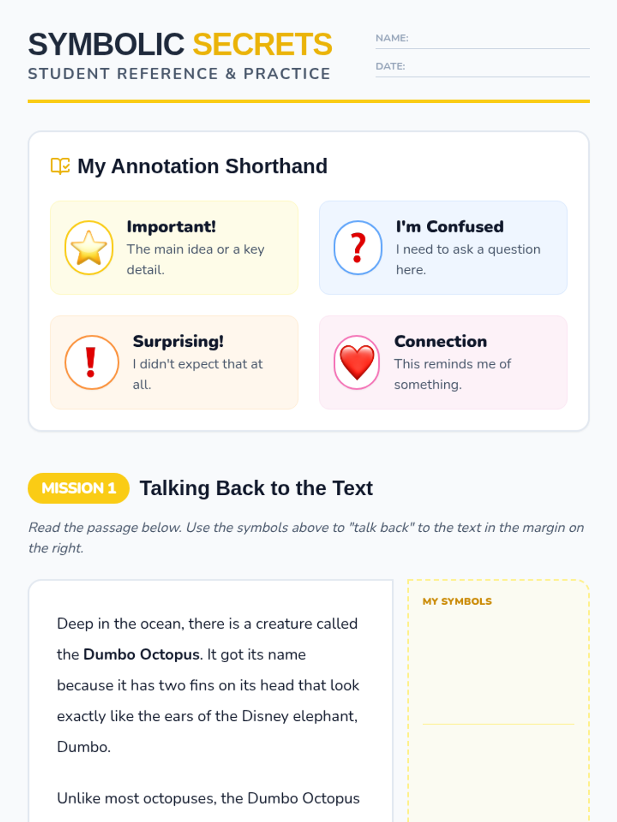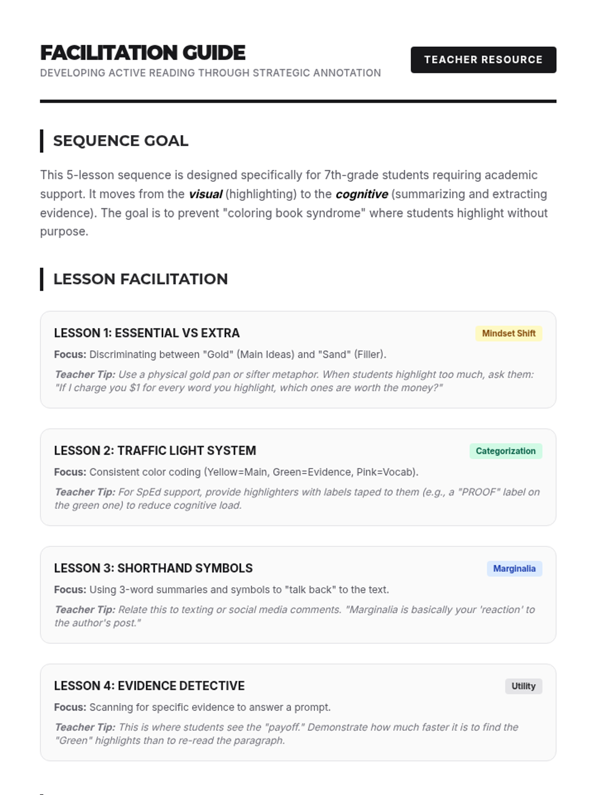 This sequence transitions students from passive reading to active engagement using systematic annotation strategies designed for diverse learners. Students learn to distinguish essential information, apply a color-coding system, use marginalia, and extract evidence for writing.