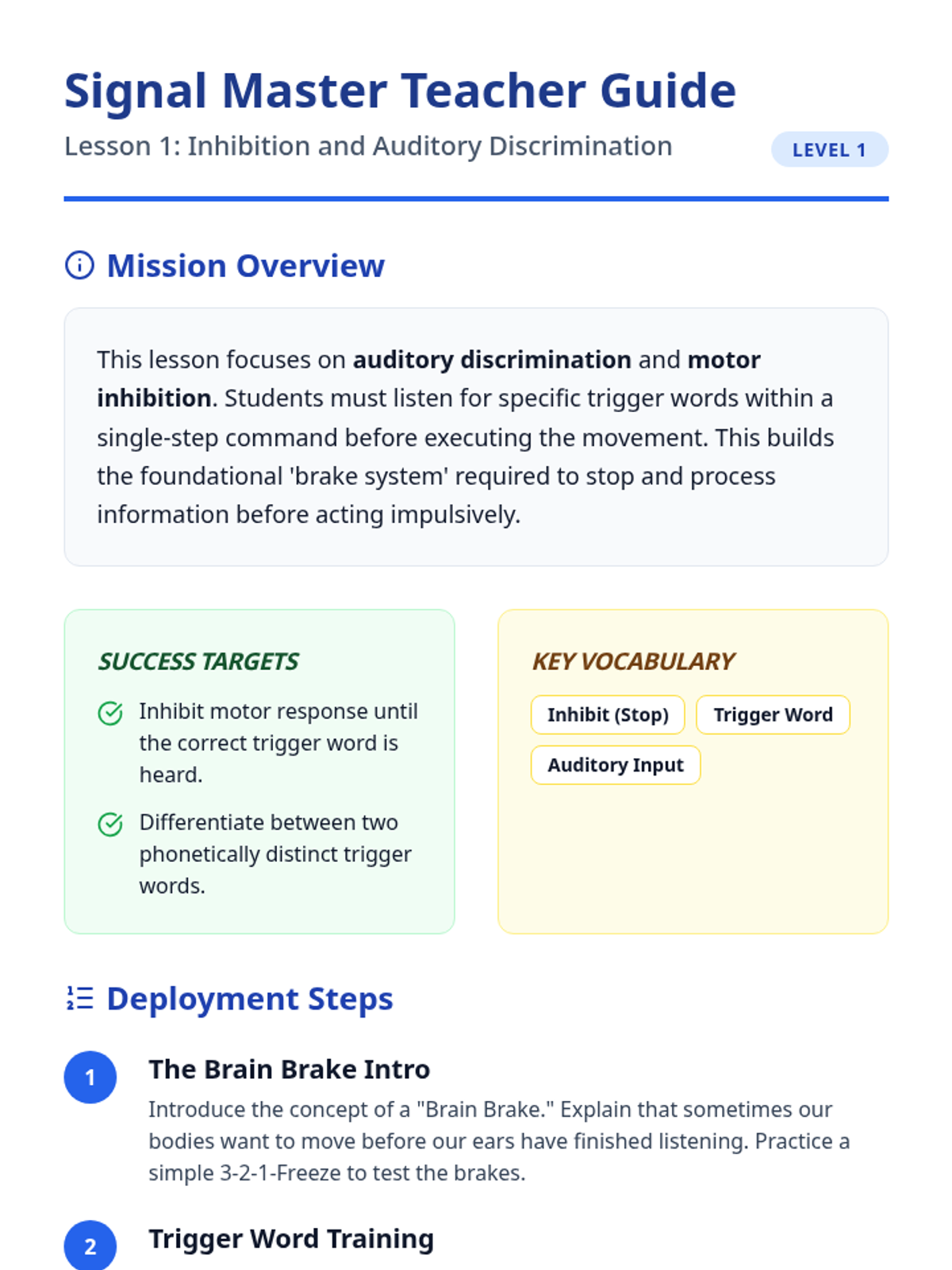 A specialized sequence for 2nd-grade students focusing on working memory and motor planning. Through gamified physical activities, students learn to inhibit immediate action, process single-step auditory commands, and execute precise movements.