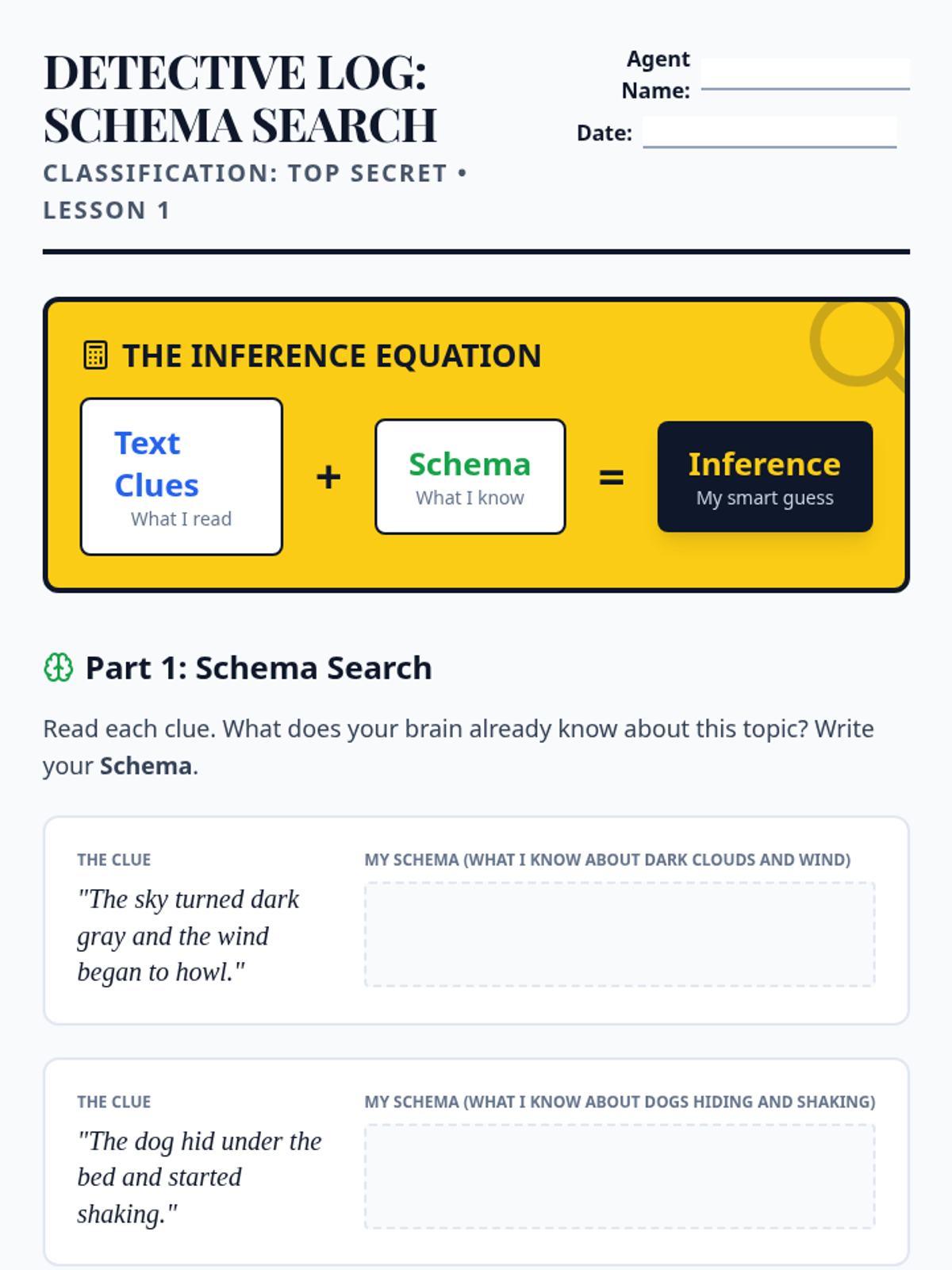 A 3rd-grade Special Education sequence focused on making inferences and citing evidence using a 'Text Detective' theme. Students learn the 'It Says... I Say... And So...' strategy to synthesize text clues with background knowledge (schema) to form valid conclusions.