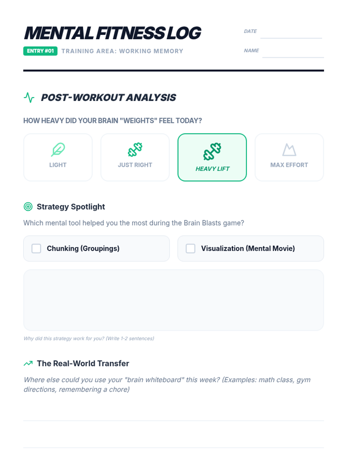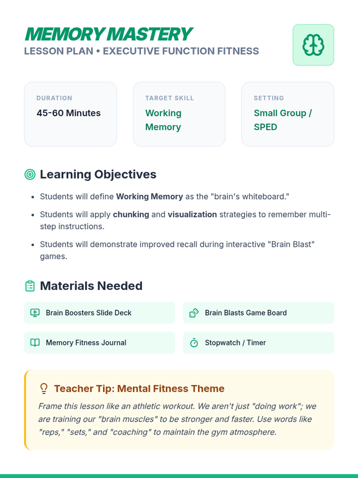 A comprehensive unit designed for 7th and 8th-grade special education students to strengthen executive functions. Through a 'mental fitness' theme, students practice working memory, cognitive flexibility, and impulse control through games and reflective journaling.