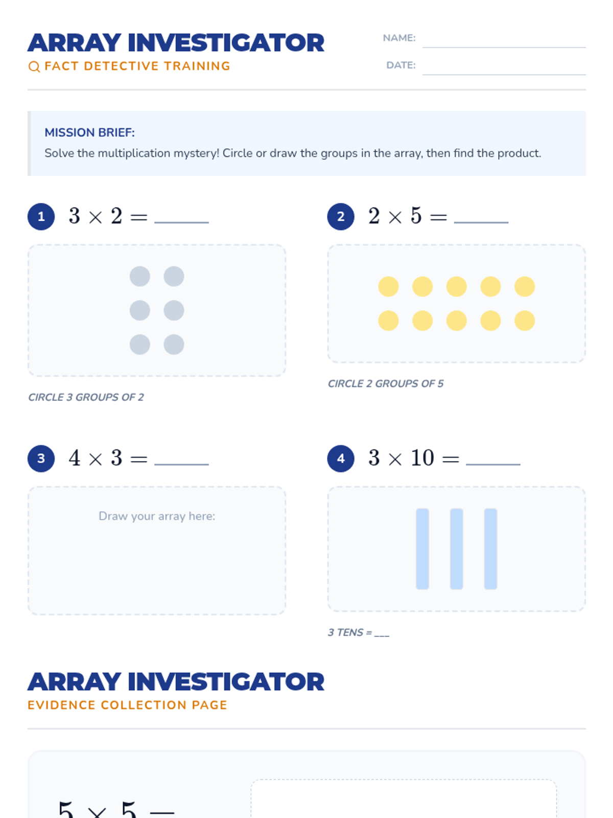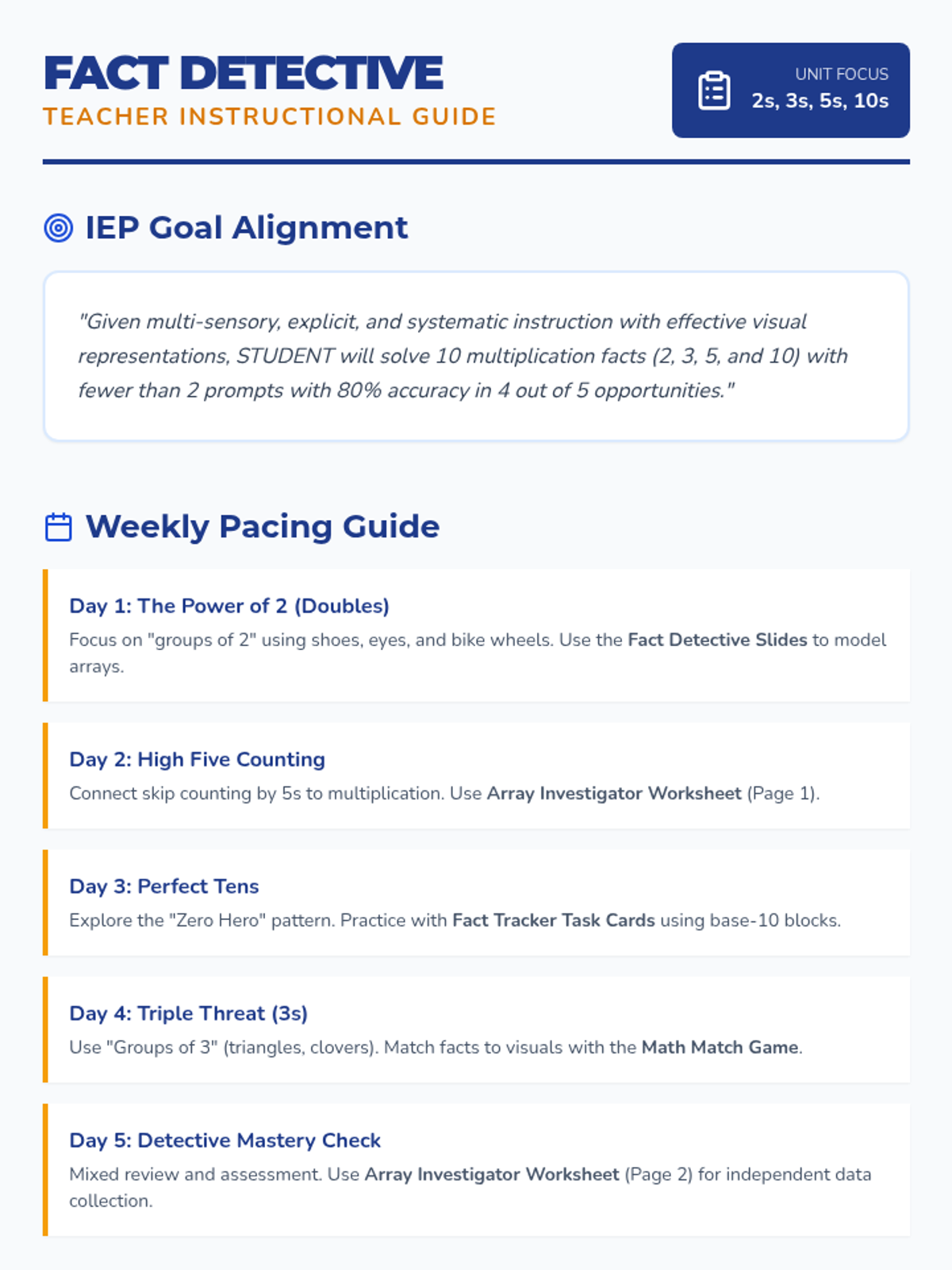 A comprehensive week-long intervention designed for students working on multiplication facts for 2, 3, 5, and 10 using multi-sensory, explicit instruction and visual arrays. This sequence includes teacher guides, instructional slides, visual worksheets, matching games, and task cards to support IEP goal mastery.