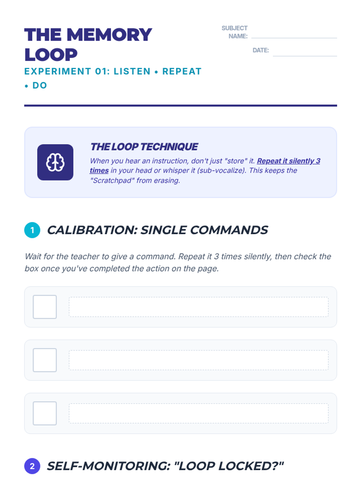 A specialized sequence for 4th-grade students to develop working memory through verbal rehearsal. Students practice the 'Hear-Repeat-Do' strategy, identify action keywords, utilize processing pauses, and verify their work to improve follow-through on single-step directions.