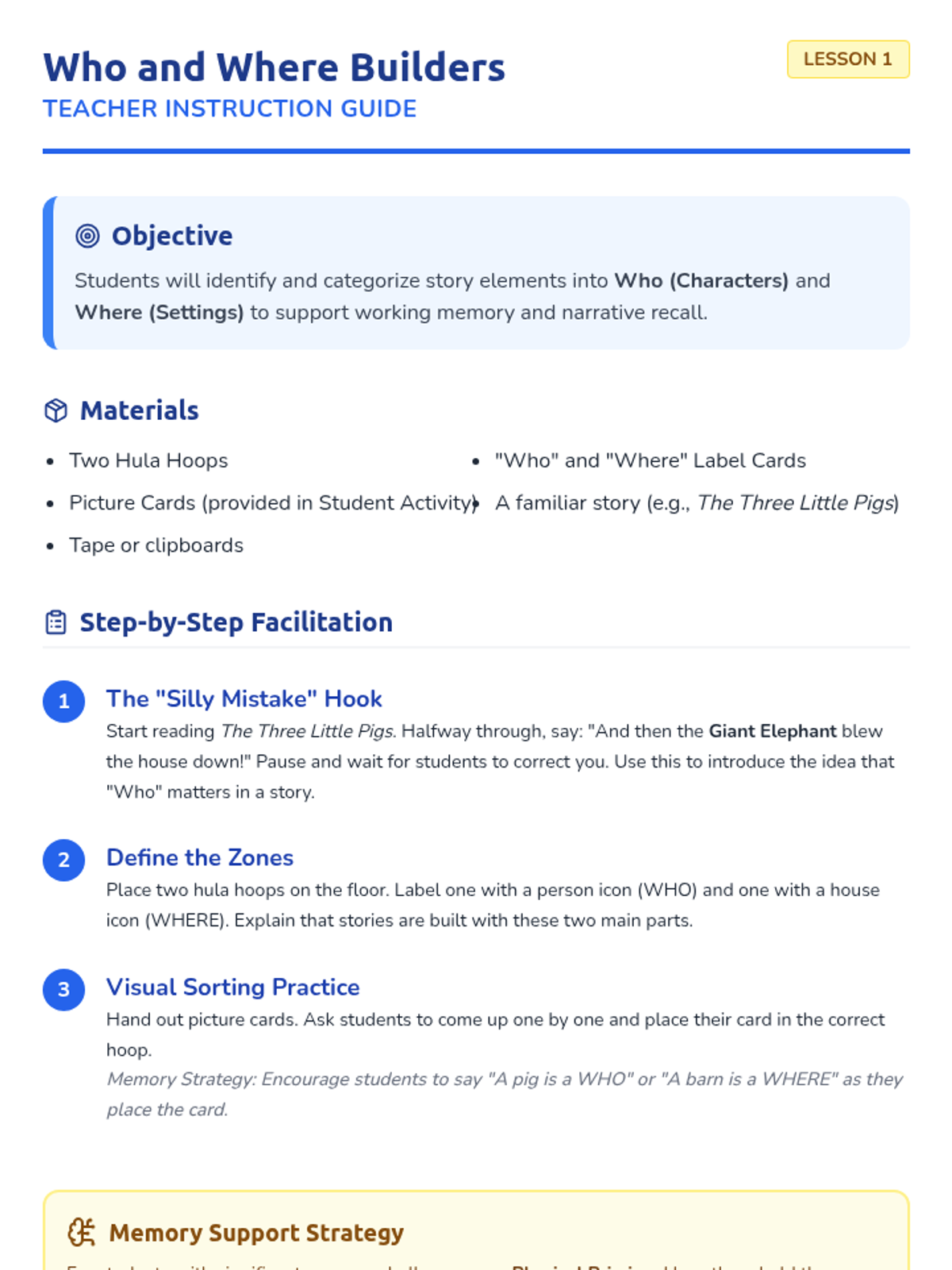 A 5-lesson sequence for Pre-K students focusing on visual supports and graphic organizers to aid working memory in narrative sequencing. Students use tactile and visual aids like story stones and picture cards to categorize elements, sequence events, and retell stories.