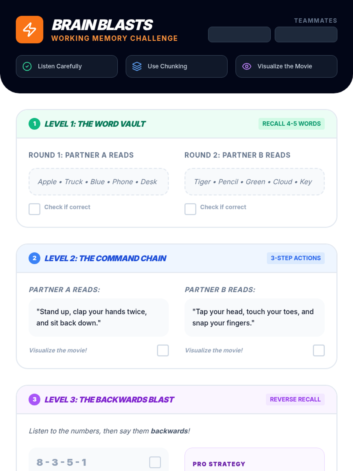 A 5-lesson sequence designed for 8th-grade students to improve working memory and auditory processing. Students learn verbal rehearsal, active listening, and self-advocacy strategies to effectively manage and execute single-step instructions.