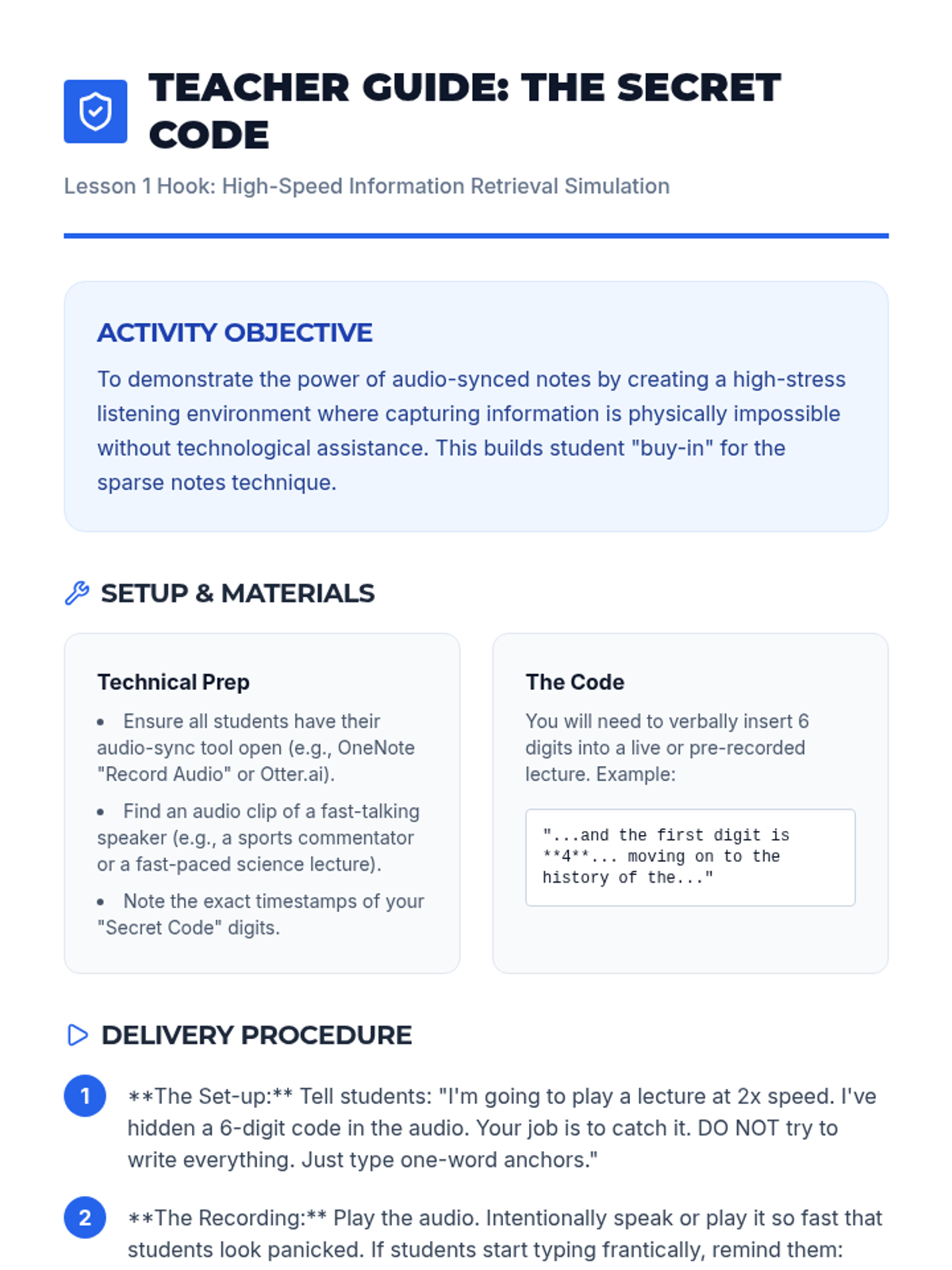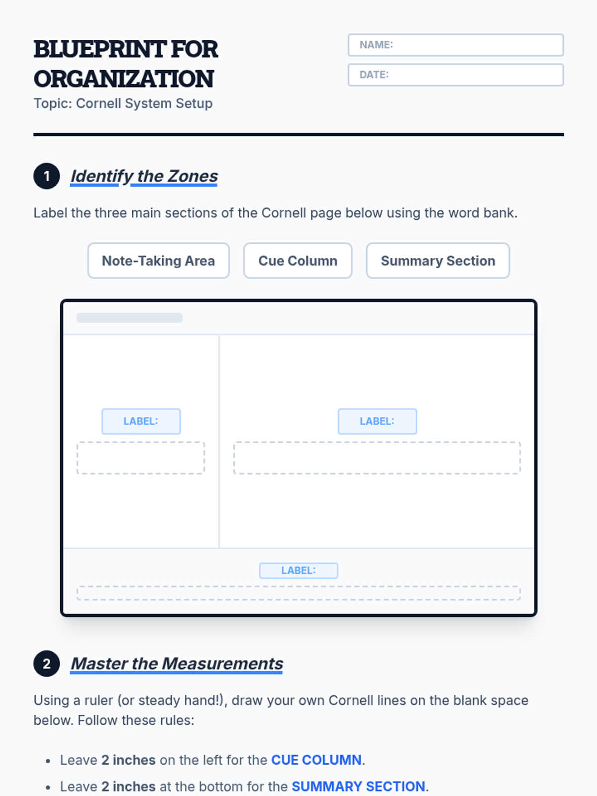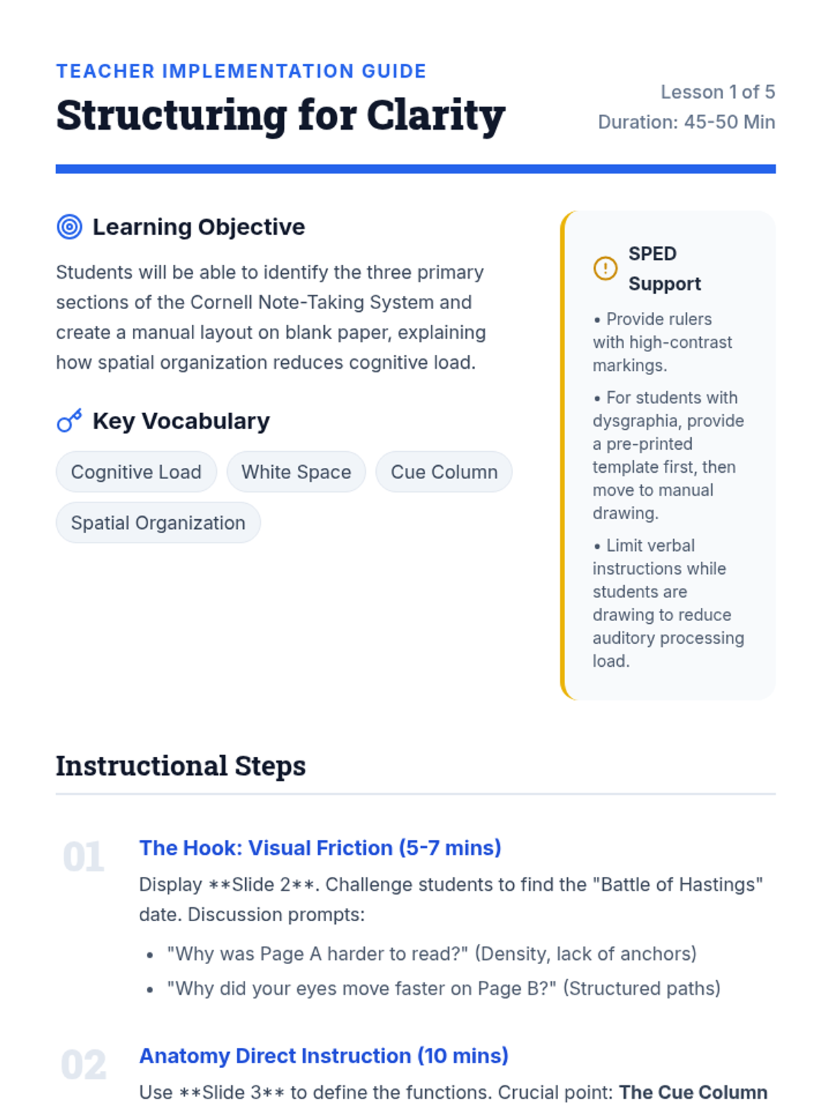 A 5-lesson sequence designed for 11th-grade students to master the Cornell Note-Taking System. The curriculum focuses on reducing cognitive load and supporting working memory through structured page formatting, keyword identification, synthesis, and retrieval practice.