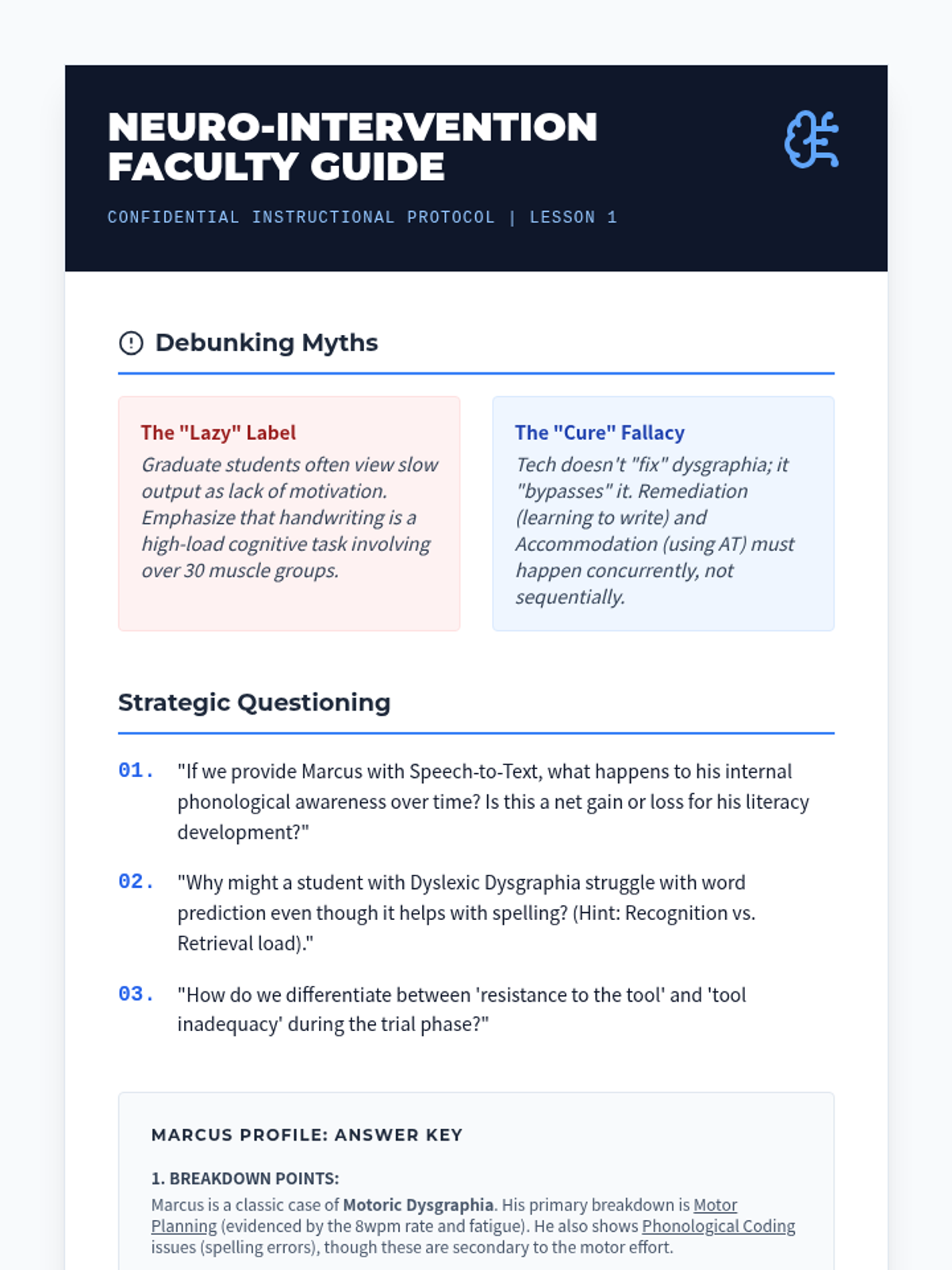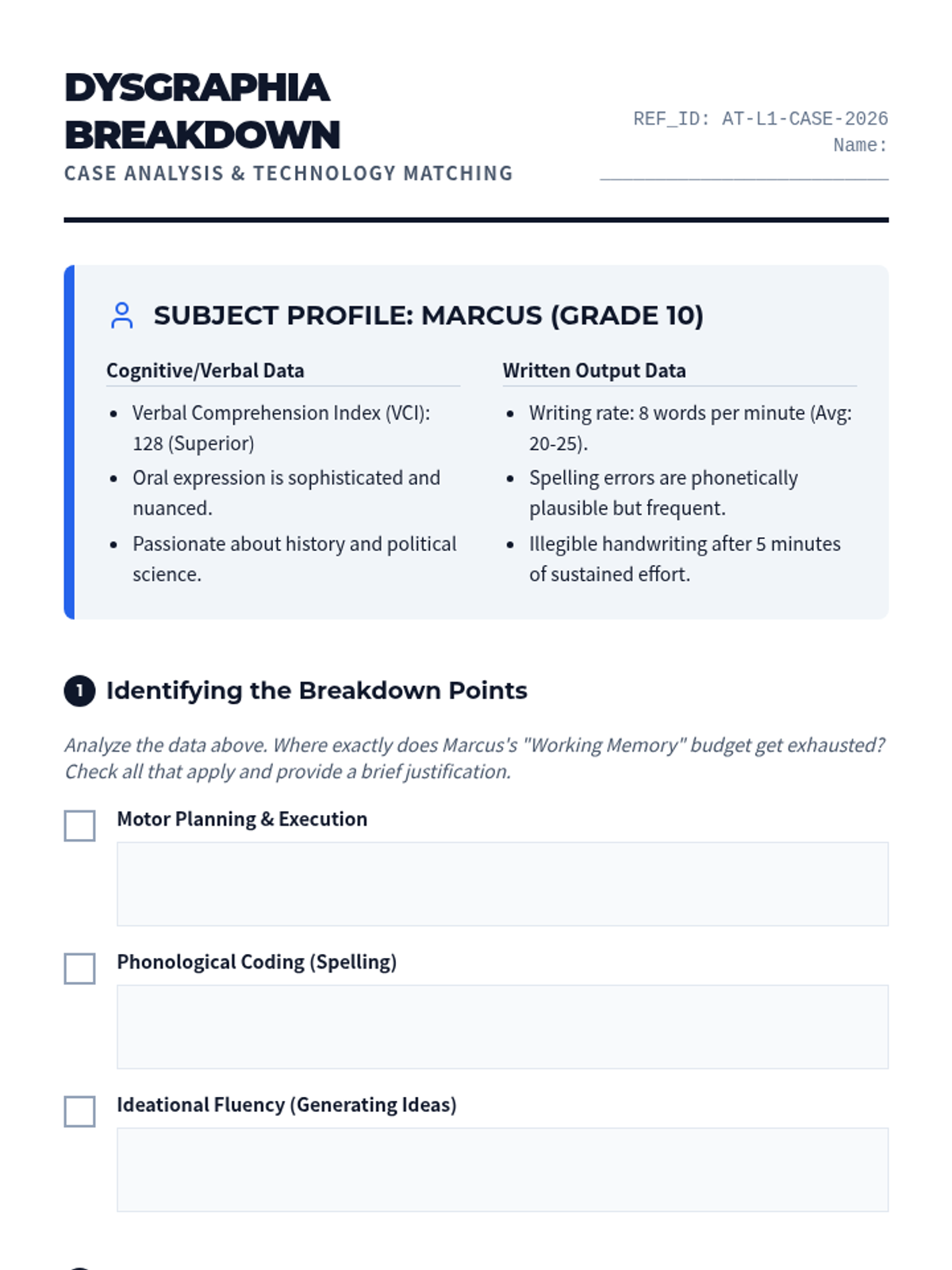 This graduate-level sequence prepares educators to evaluate and select assistive writing technologies using evidence-based frameworks like SETT. It covers the neurology of dysgraphia, technical analysis of speech-to-text and word prediction, and the legal requirements for IEP implementation.