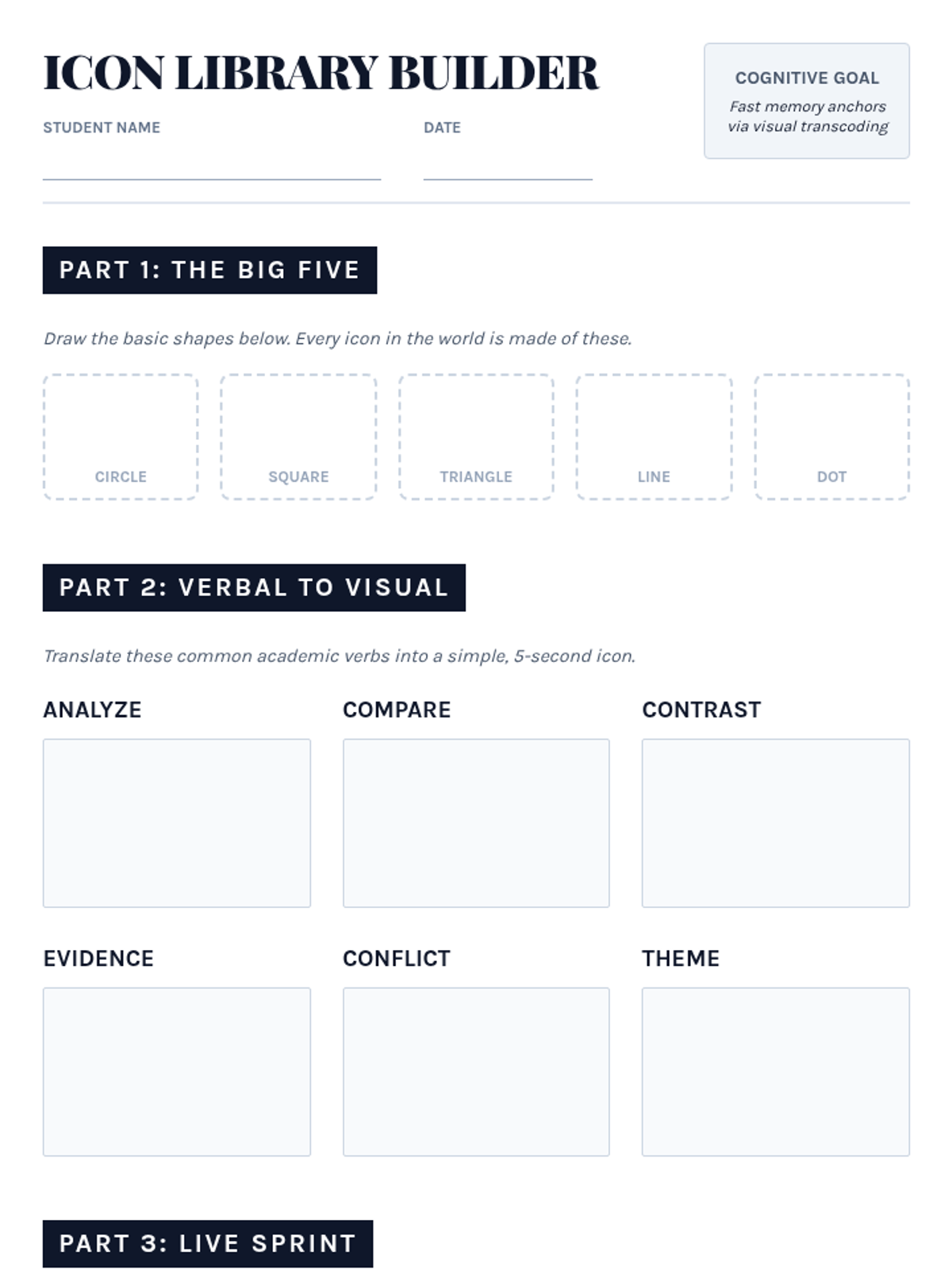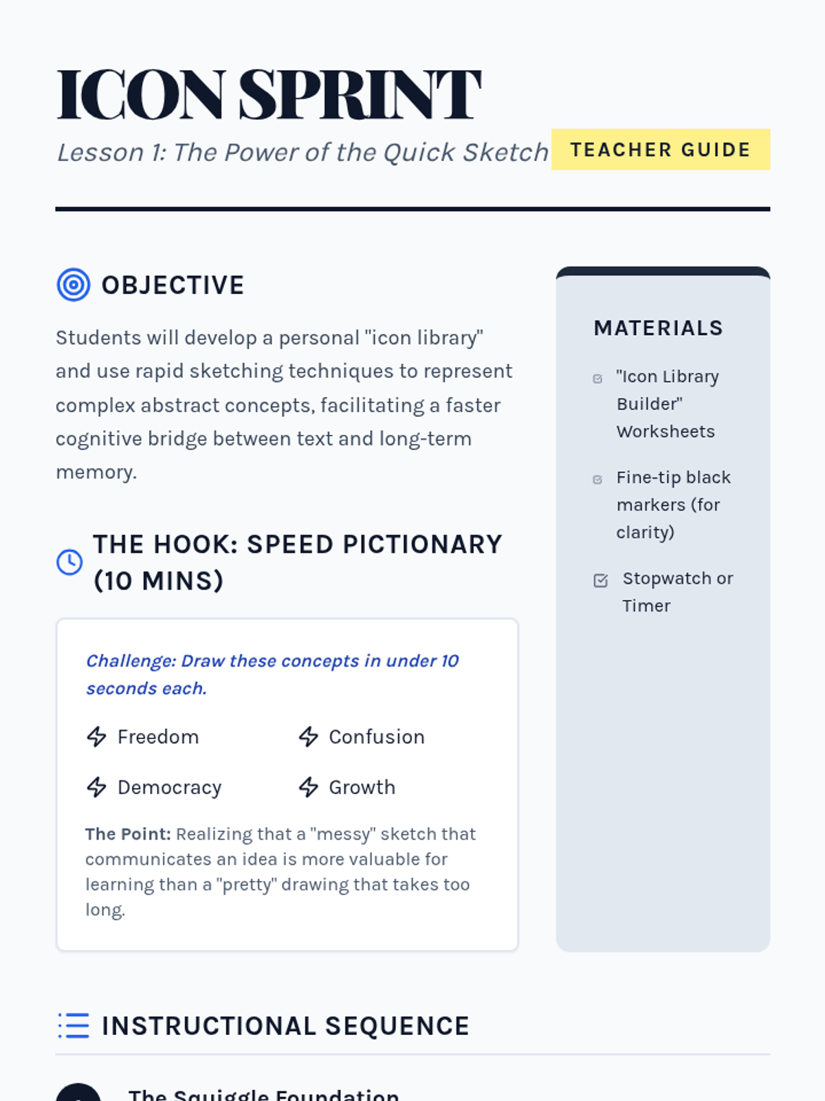 A specialized intervention sequence for 12th-grade students who struggle with verbal processing, focusing on 'Sketch-to-Stretch' strategies to improve memory retention and reading comprehension through visual transcoding. Students progress from simple icons to complex thematic maps, learning to anchor abstract academic concepts in physical drawings.