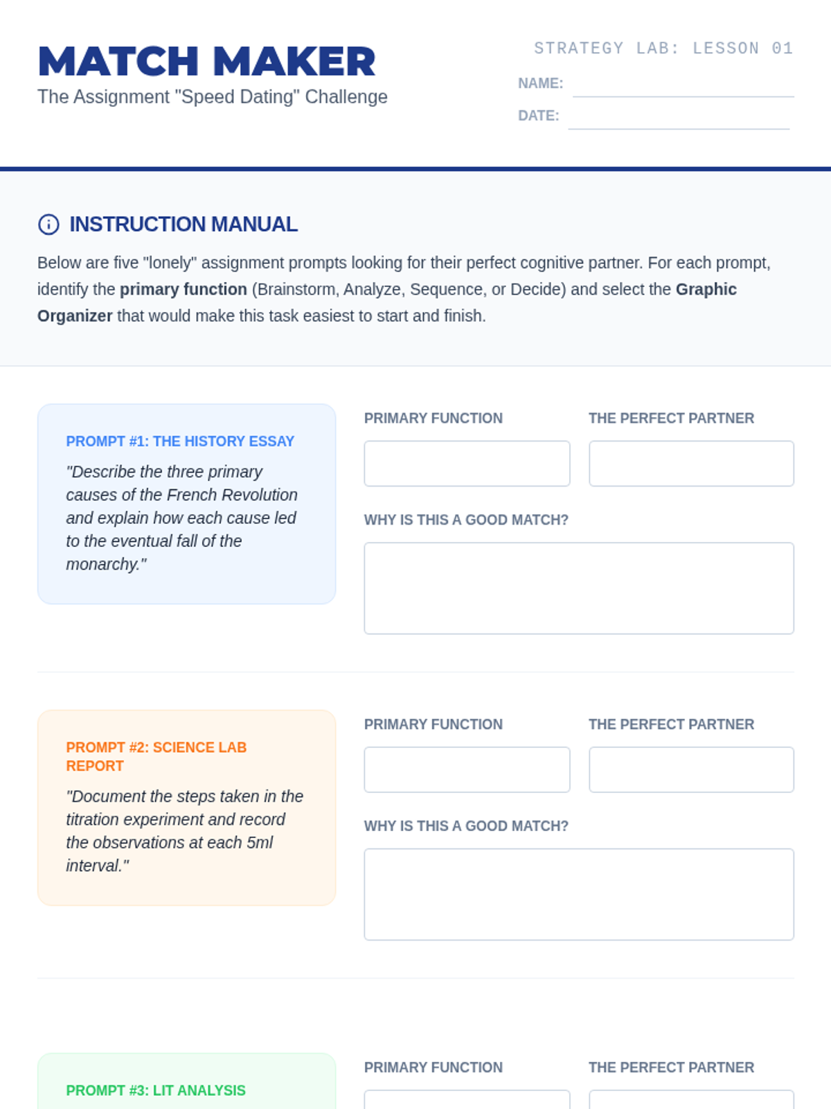 This sequence teaches 6th-grade students how to manage cognitive load by breaking down complex instructions into single, manageable steps. It covers reverse engineering, chunking text, prioritizing the first step, digital task management, and logical sequencing.