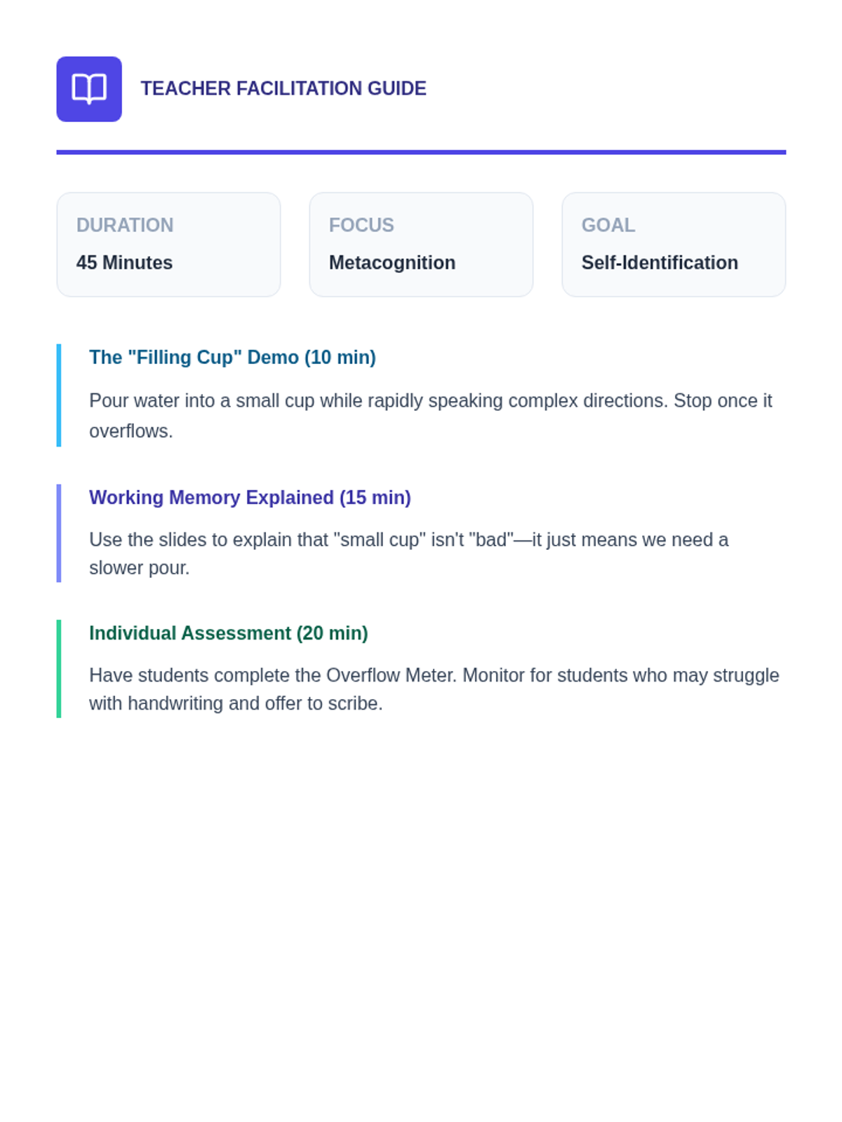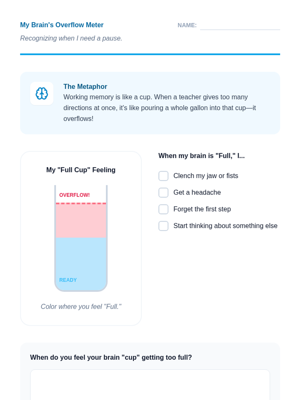 This sequence empowers 6th-grade students with working memory challenges to recognize cognitive overload and advocate for single-step directions. Students develop metacognitive awareness and a practical 'clarification toolkit' to manage learning inputs effectively.