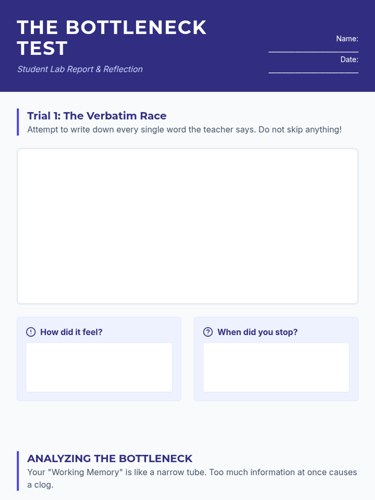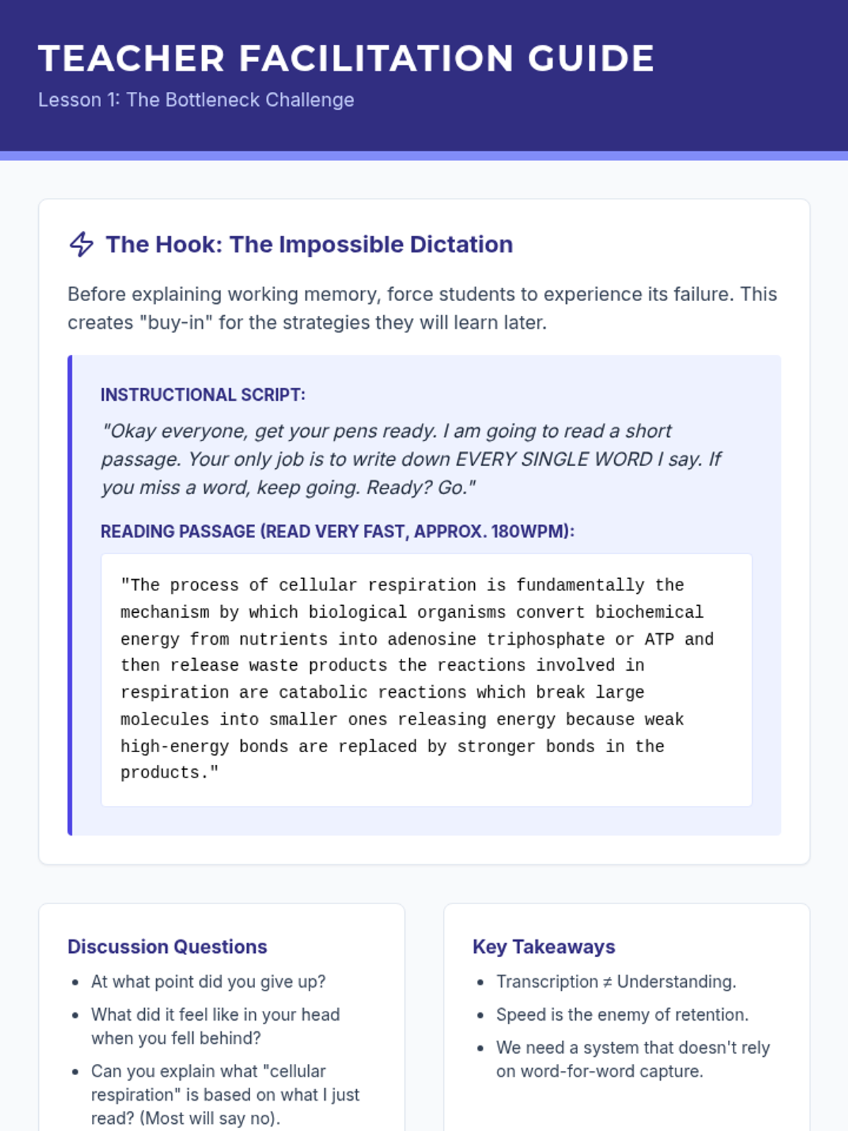 This inquiry-based sequence teaches 10th-grade students with working memory challenges how to use visual note-taking strategies to capture spoken information. Students explore the 'cognitive bottleneck,' practice spatial page segmentation, develop a personal visual shorthand, and use their notes for retrieval practice.