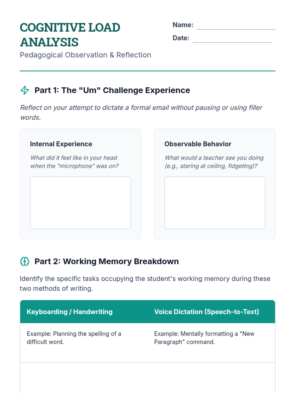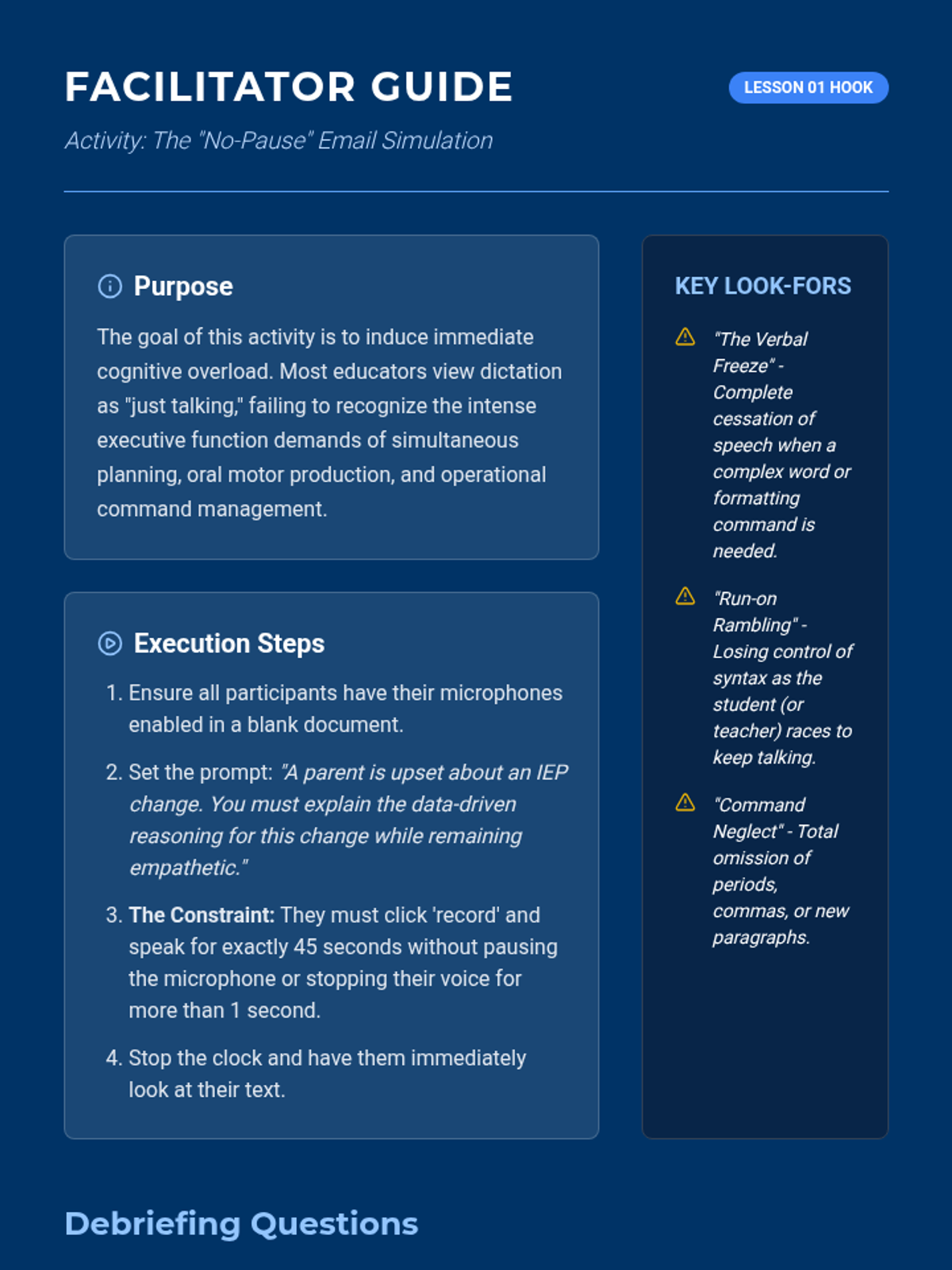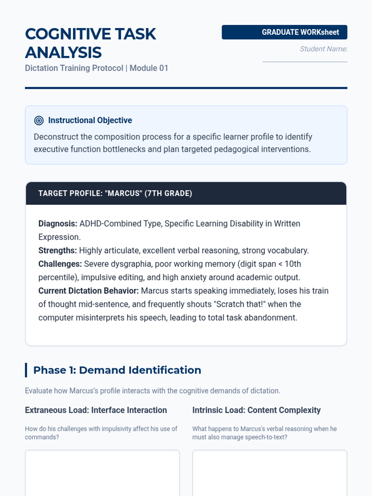 A comprehensive training program for future special educators on the pedagogy of speech recognition. This sequence focuses on transitioning students from traditional writing to verbal composition by addressing cognitive load, instructional modeling, command scaffolding, and error resilience.