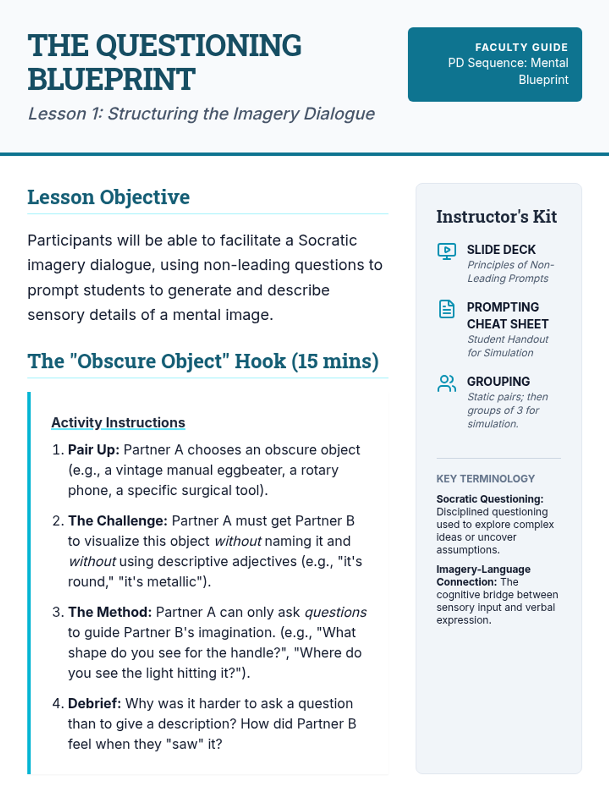 A professional development sequence for graduate-level educators on implementing explicit imagery instruction protocols to support reading comprehension. This sequence covers the progression from basic questioning to independent student visualization.