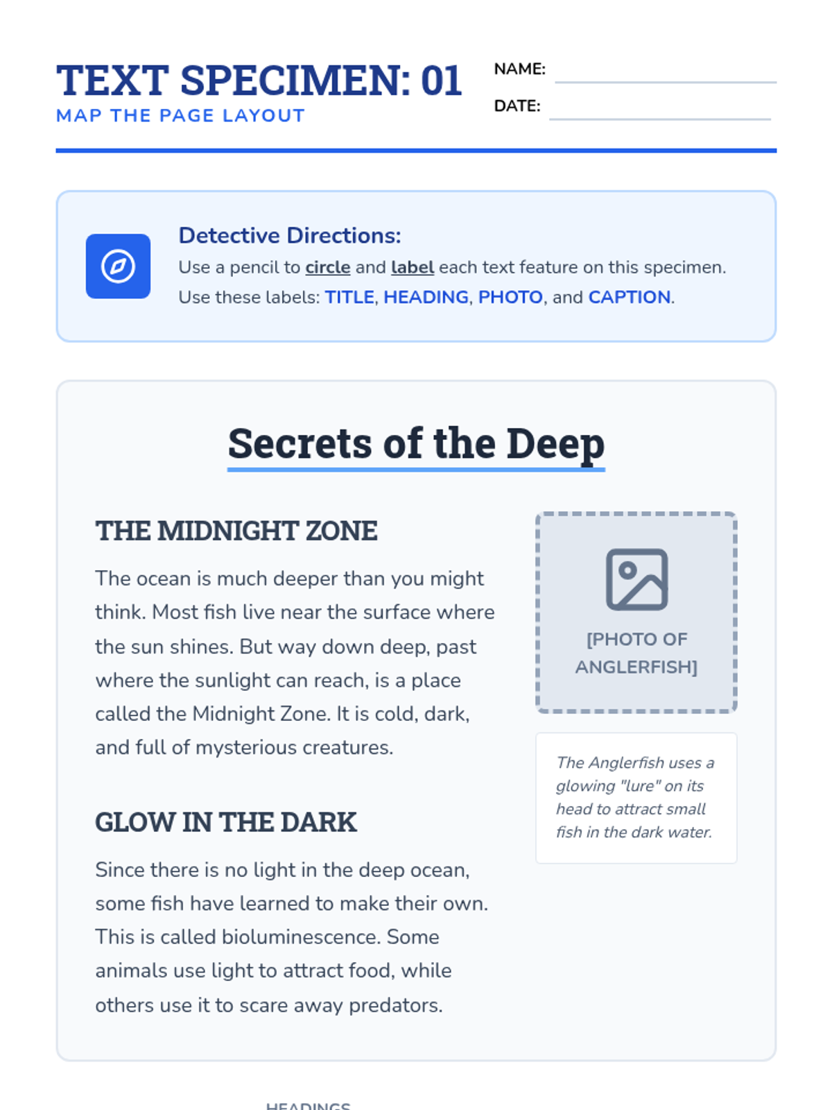 A 3rd-grade sequence focused on teaching students with processing difficulties how to navigate informational texts using annotation and highlighting techniques. Through a 'text detective' theme, students analyze informational articles as 'specimens' to identify features, vocabulary, and main ideas.