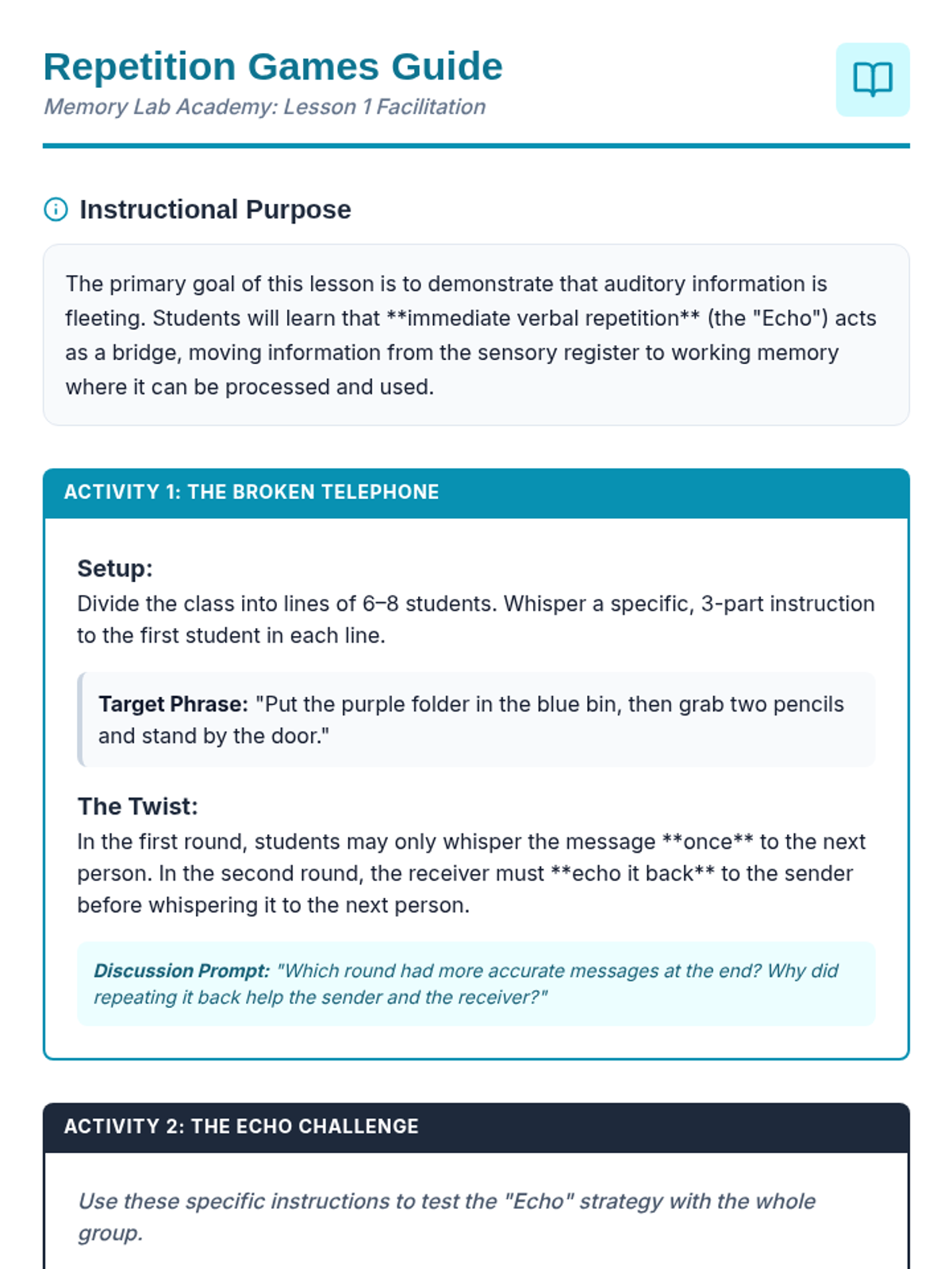 This sequence teaches 3rd-grade students verbal rehearsal strategies to improve auditory working memory. Students progress from vocal repetition to whispered self-talk and finally silent inner speech, using games and mnemonics to hold information active while completing complex tasks.
