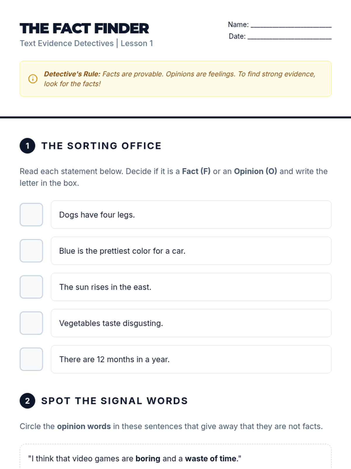 A 5-lesson sequence designed for 6th-grade special education students to master text highlighting and annotation. Students act as 'Text Detectives' to identify, scan, categorize, and evaluate textual evidence to support argumentative writing.