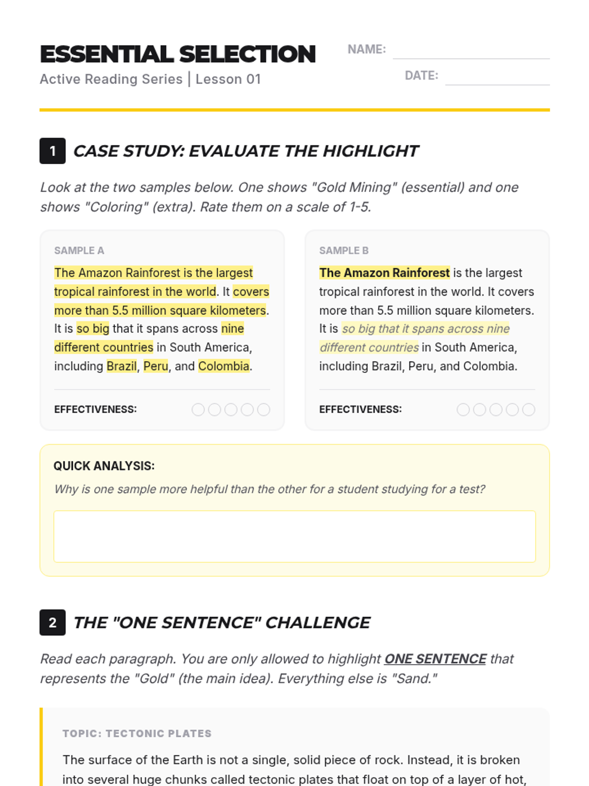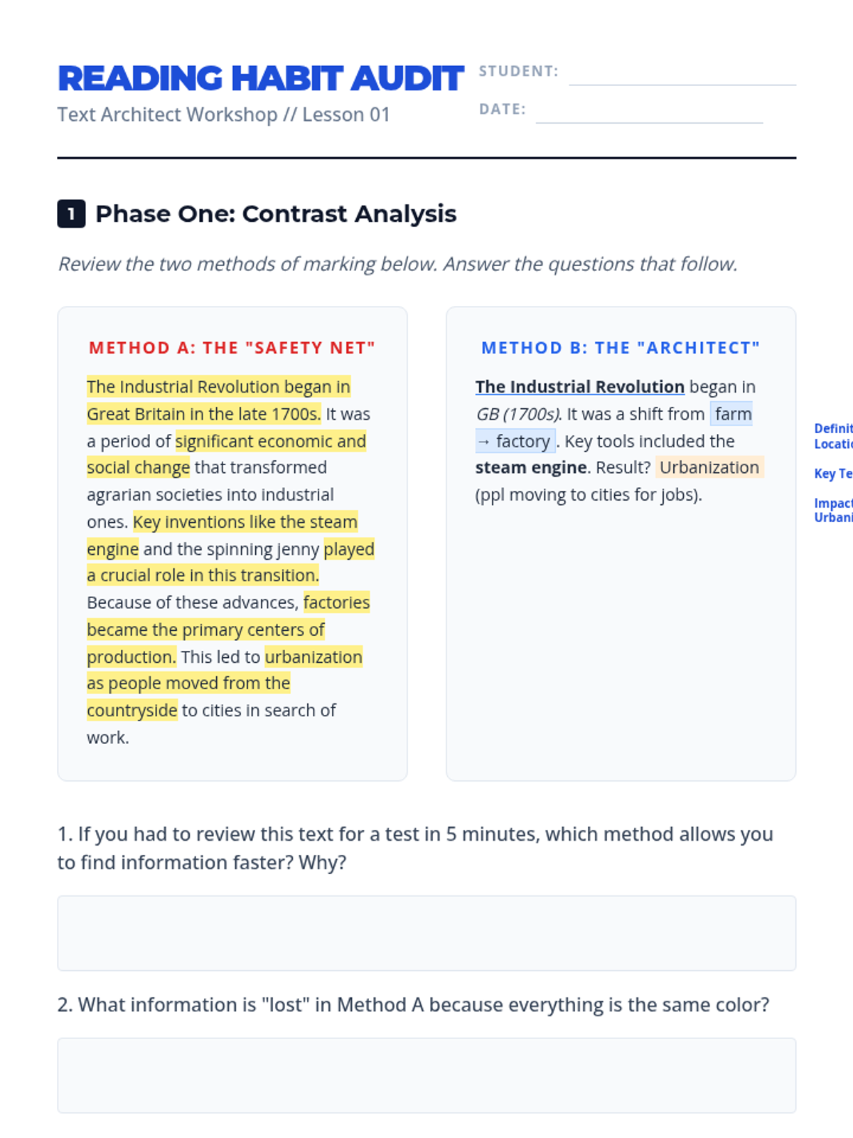 An advanced workshop sequence for high school seniors to transition from passive reading to active text analysis. Students develop personalized systems for color-coding, marginalia, and strategic filtering to navigate complex academic texts.
