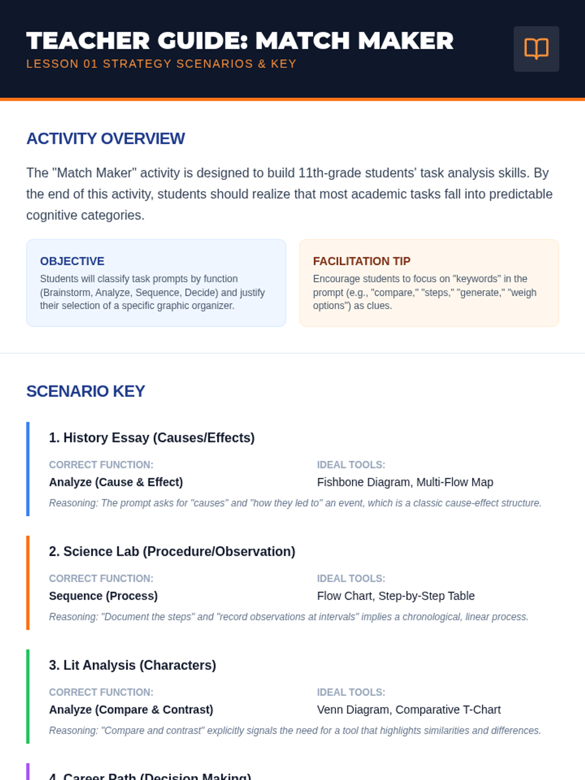 A sequence for 11th-grade students focused on fostering metacognitive independence by teaching them how to analyze academic tasks and select, adapt, and apply the most effective graphic organizers and digital tools for their specific learning needs.