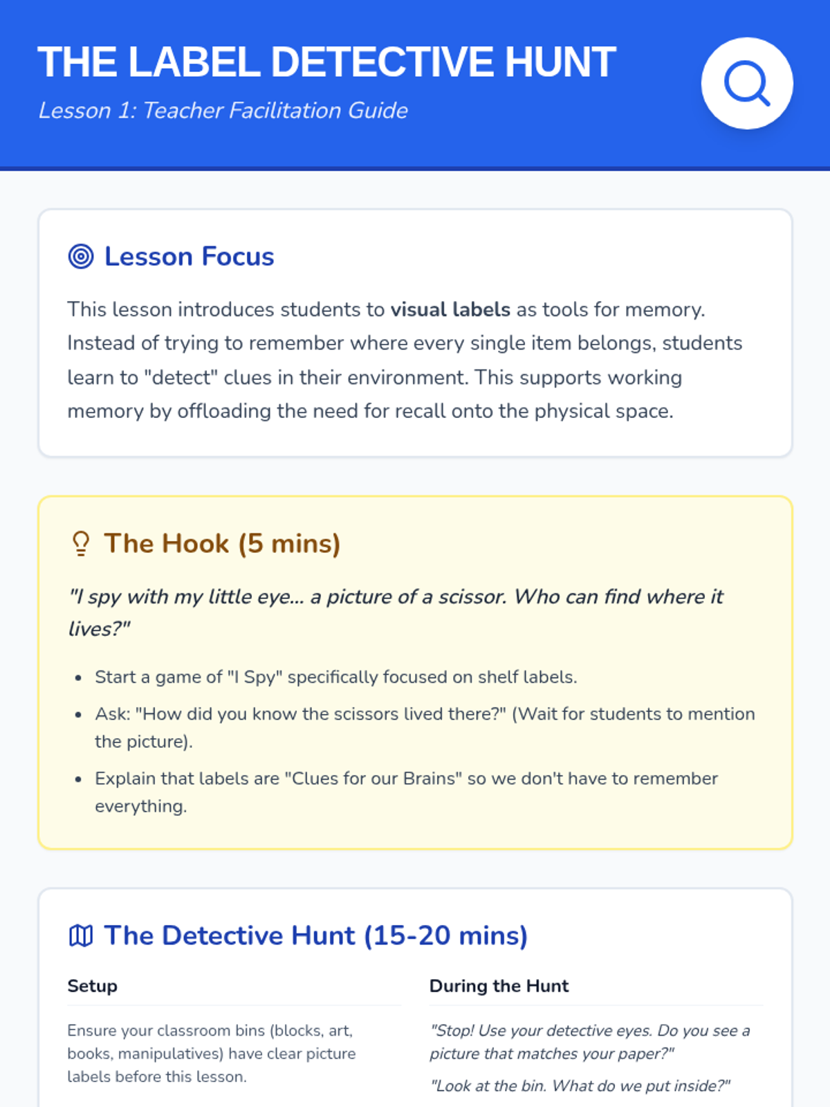 A series of mini-lessons designed to help students understand and optimize their working memory through environmental organization and cognitive strategies.