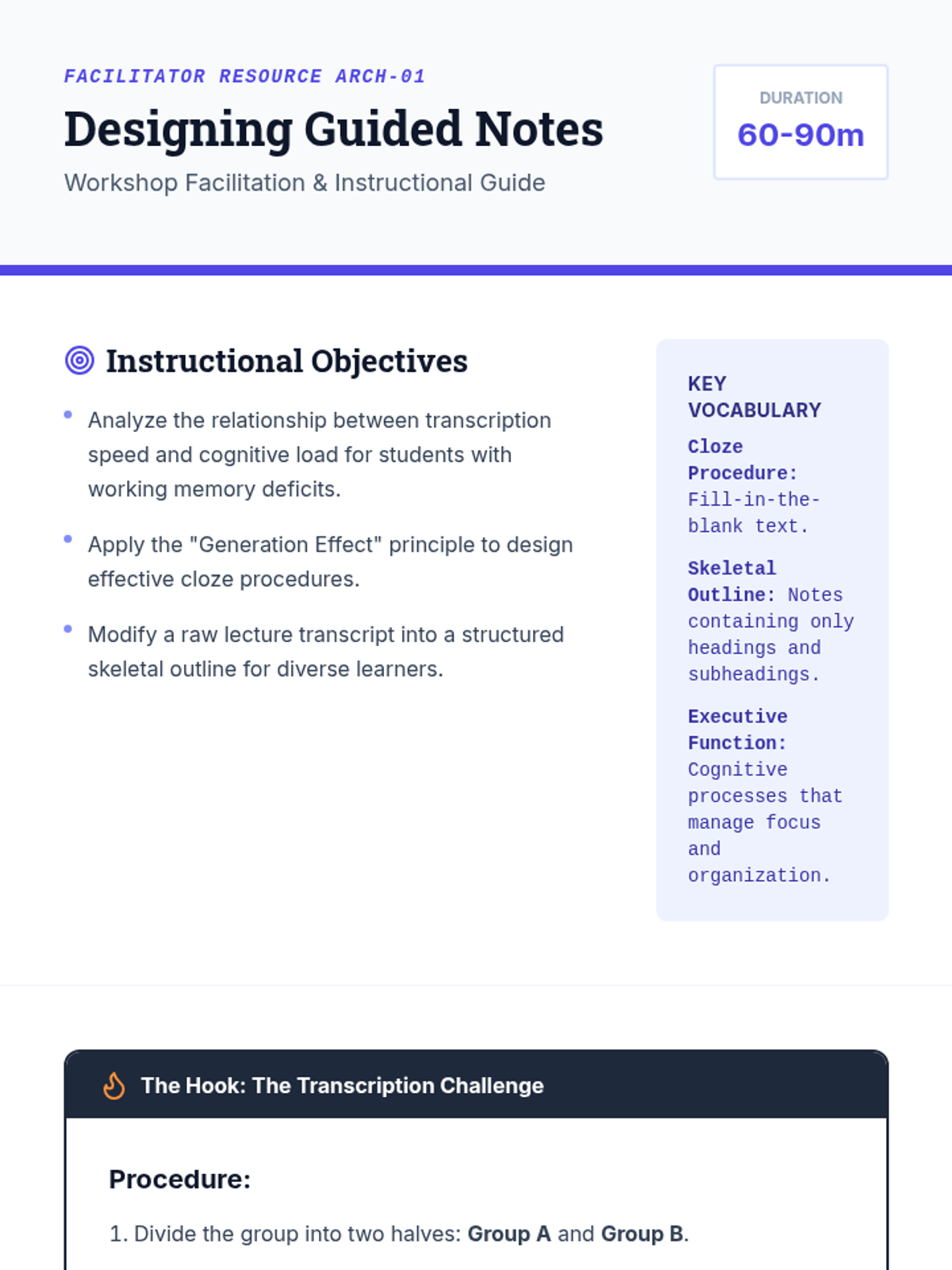 A graduate-level workshop sequence focused on designing analog scaffolding tools like guided notes and modified Cornell systems to support learners with working memory and executive functioning challenges.