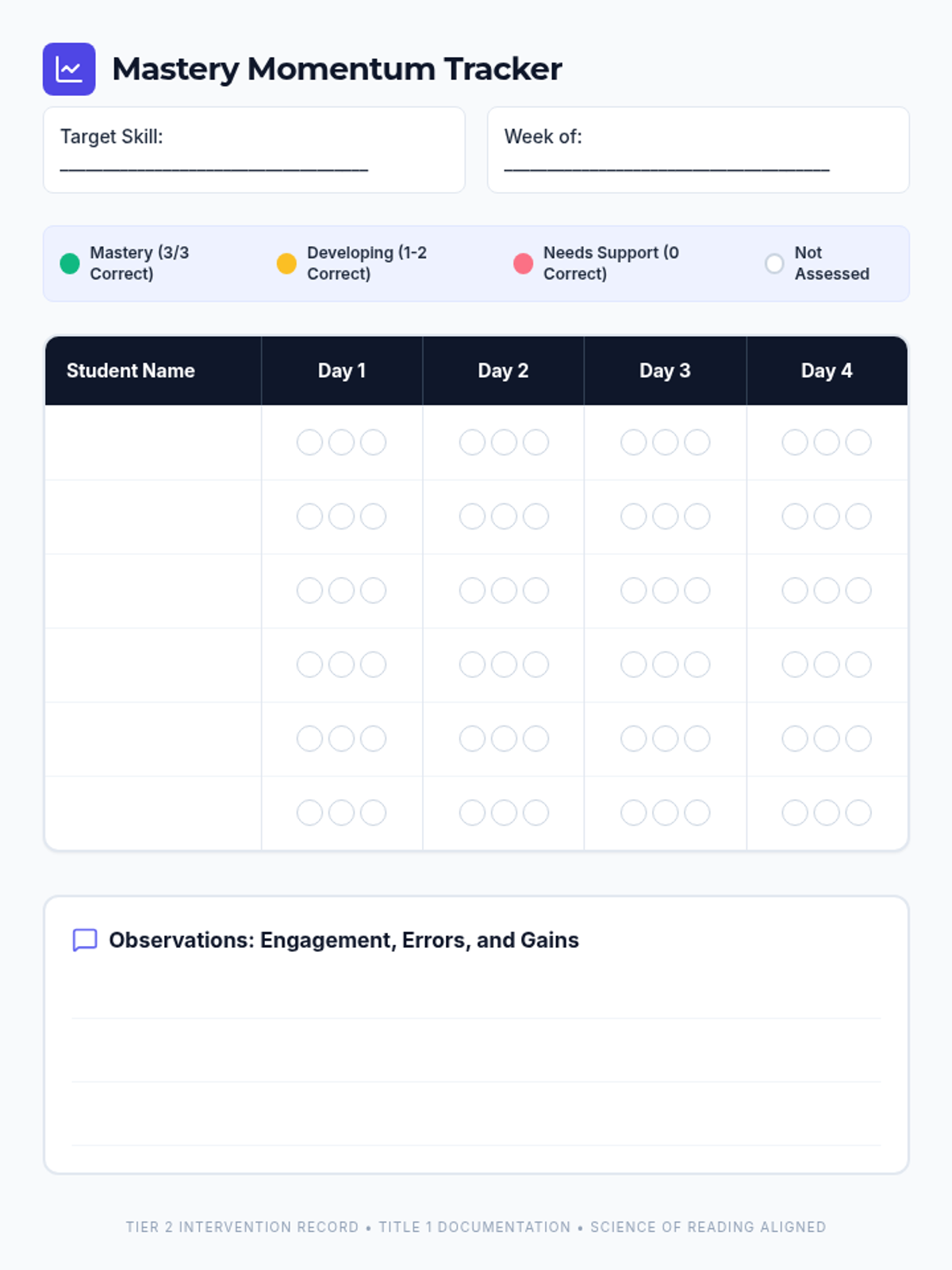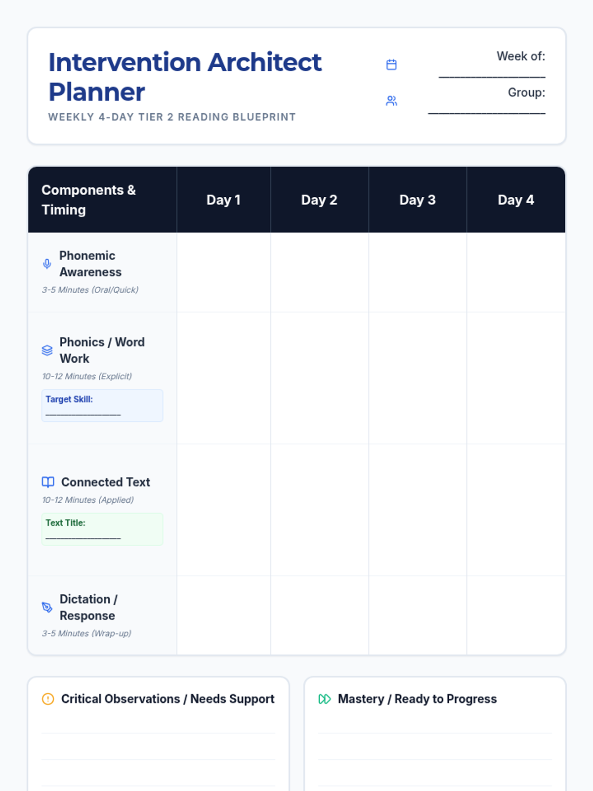 A comprehensive 4-day planning framework and resource set for Tier 2 reading intervention in a Title 1 setting, aligned with the Science of Reading.