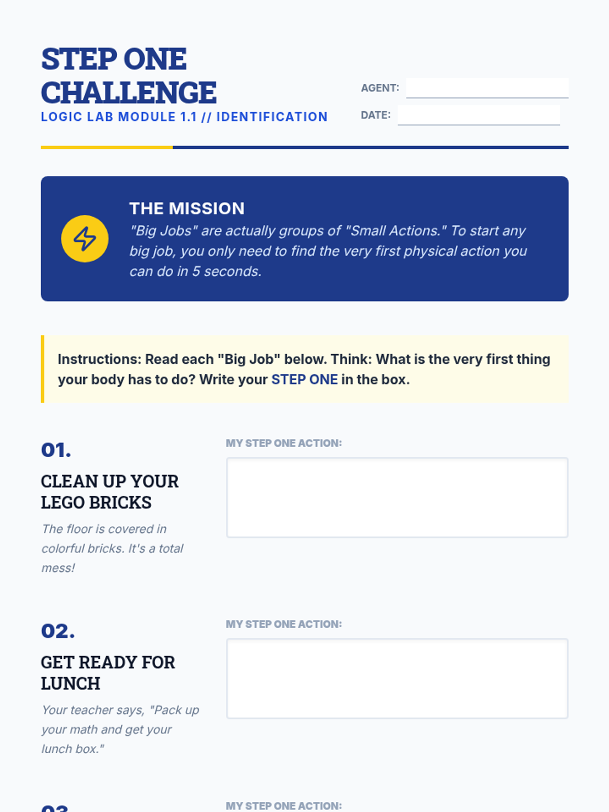 A 5-lesson sequence for 3rd-grade students focused on breaking down complex, multi-step tasks into manageable single-step directions to support working memory and executive function. Students learn to identify the first step, 'debug' complex instructions, and use metacognitive strategies to manage overwhelm.