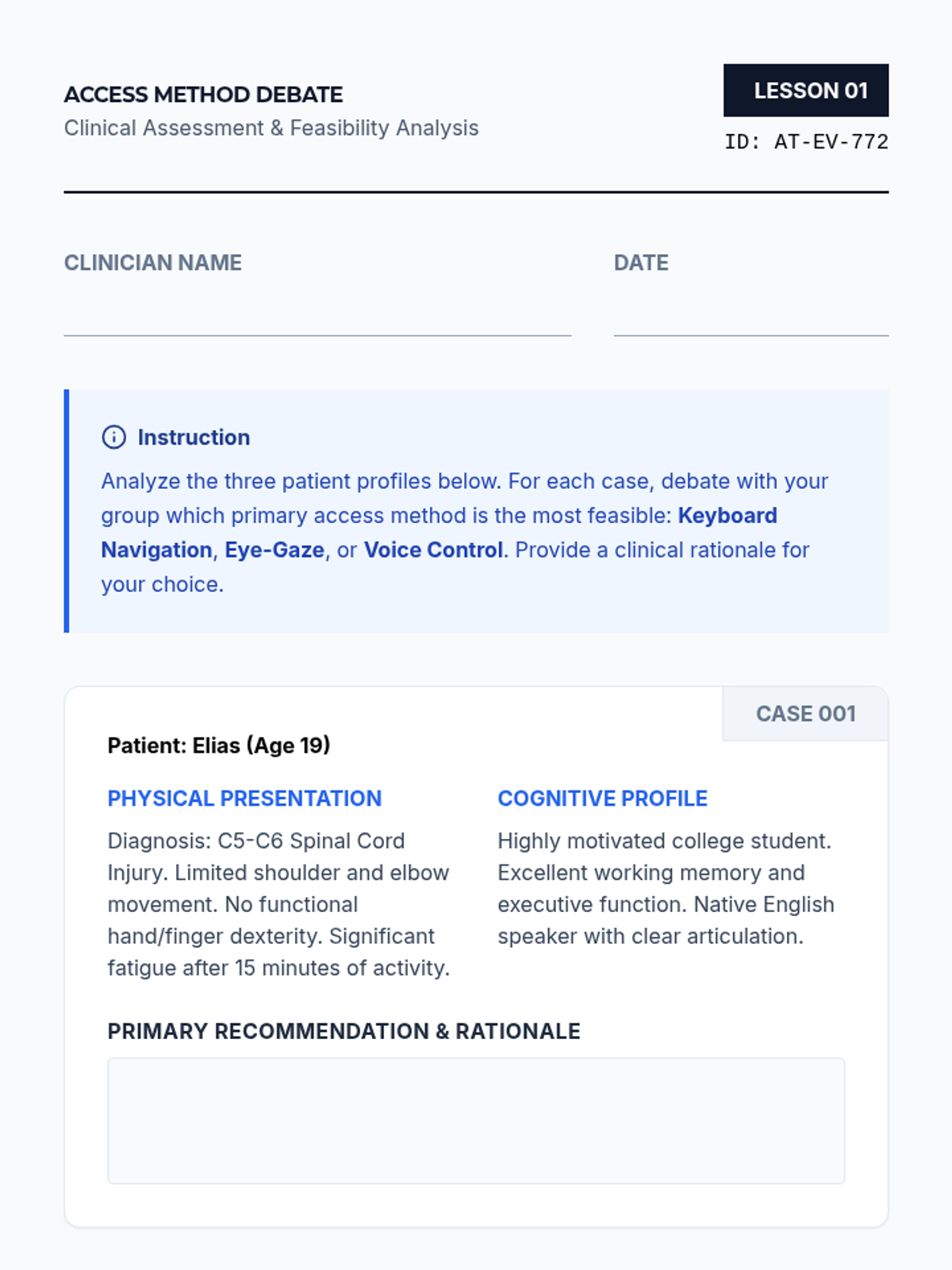 A comprehensive graduate-level sequence for future Assistive Technology specialists, focusing on the pedagogical strategies required to teach keyboard navigation and shortcuts to individuals with disabilities. The course covers assessment, scaffolding, gamification, and emotional resilience in AT training.