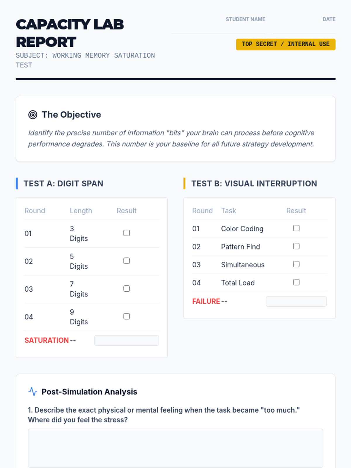 A metacognitive workshop for 12th-grade students to master cognitive load theory and develop personal 'Standard Operating Procedures' for complex academic tasks. The sequence focuses on externalizing working memory demands through visual anchors, active processing, and self-correction protocols.