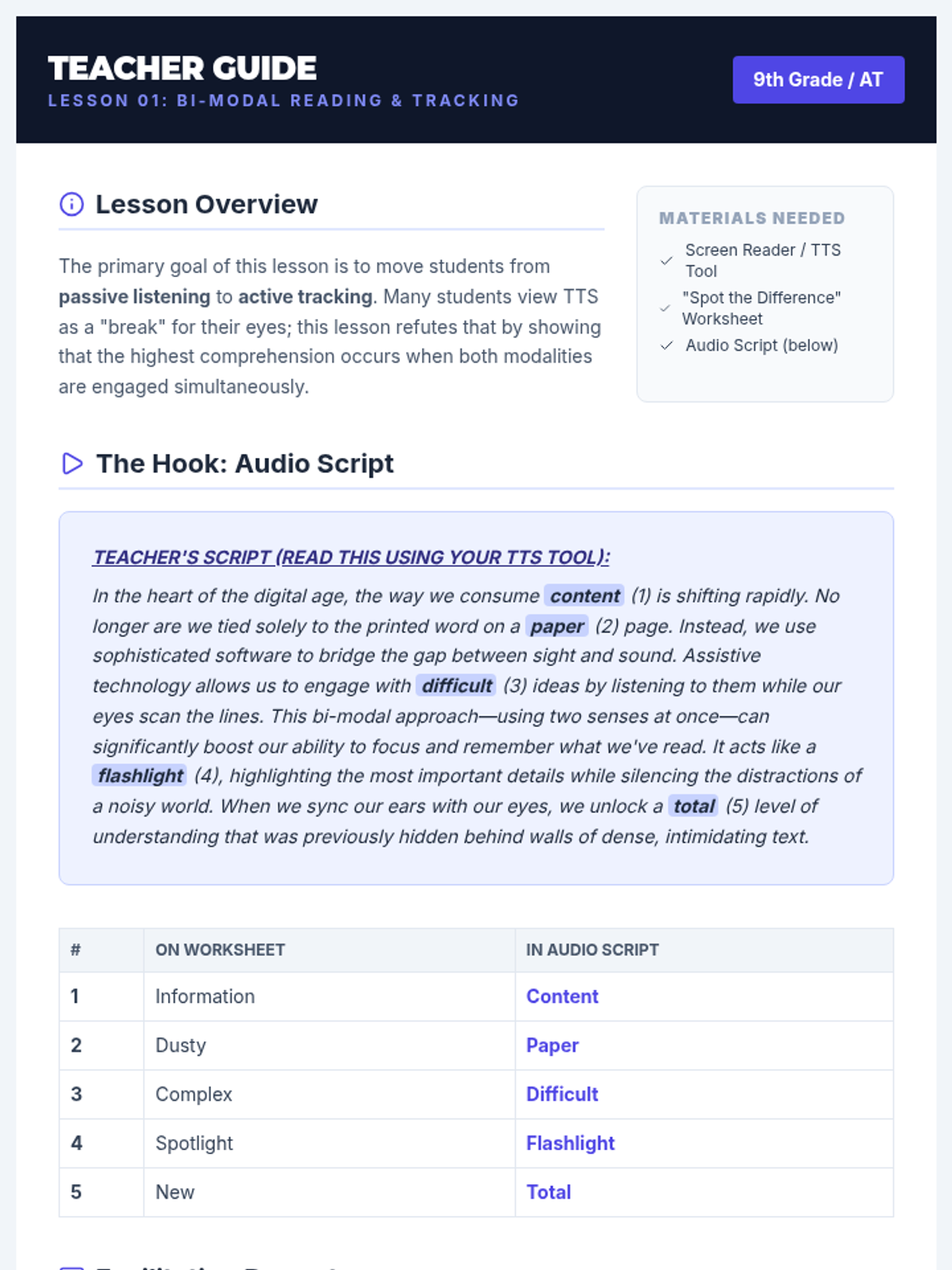This sequence guides 9th-grade students through the cognitive strategies of using Text-to-Speech (TTS) for deep comprehension. It moves from basic bi-modal tracking to advanced digital annotation and genre-specific strategy adaptation, culminating in a rigorous auditory comprehension assessment.