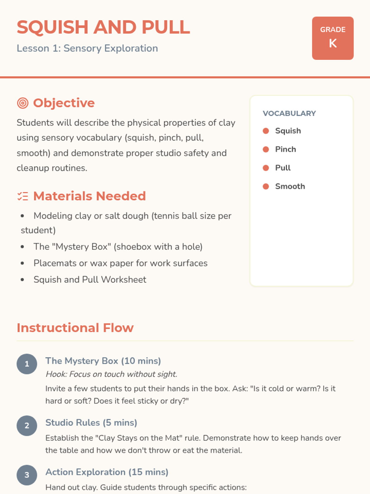 A three-session artistic journey for K-3 students exploring the creation of clay flowers, focusing on fine motor skills and seasonal themes.