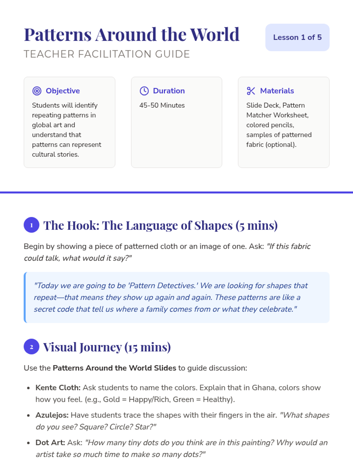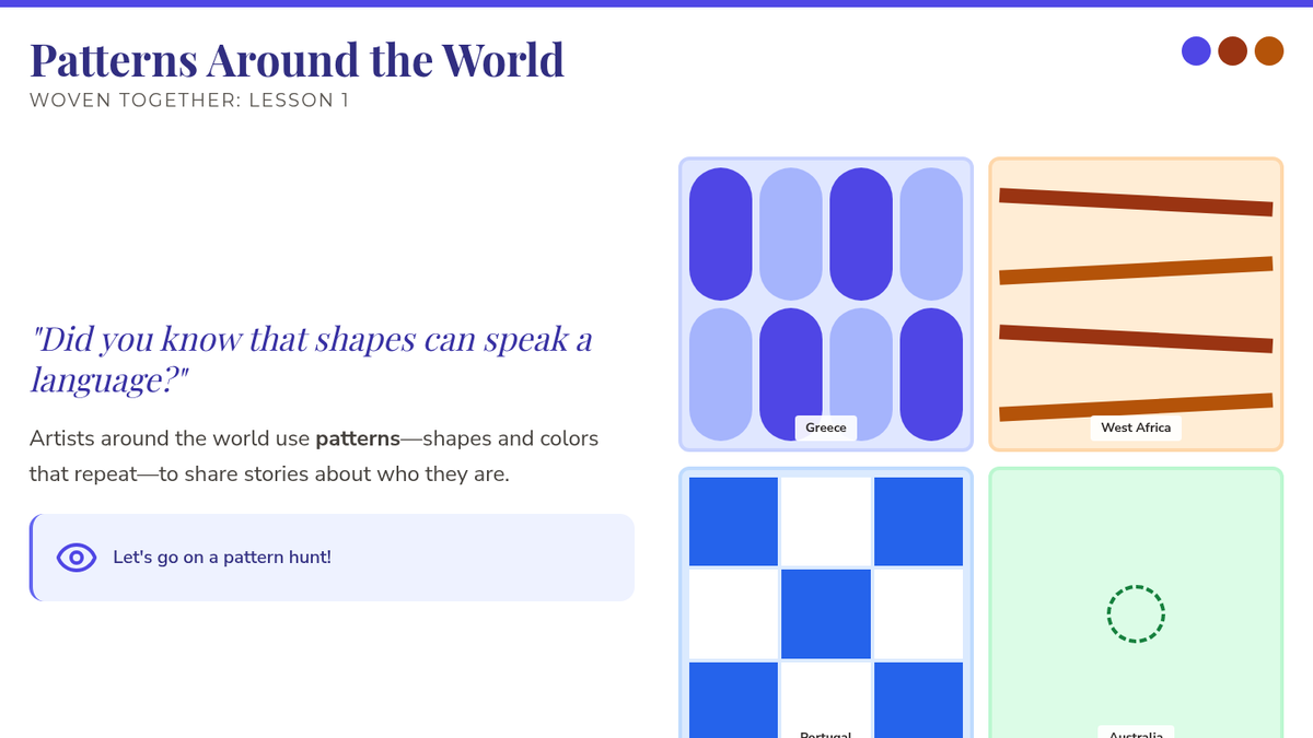 A vibrant visual arts sequence for Kindergarteners exploring Hispanic culture through the works of Frida Kahlo, Mexican Alebrijes, Papel Picado, Talavera pottery, and community murals. Students develop fine motor skills and cultural appreciation while exploring patterns, colors, and storytelling through art.