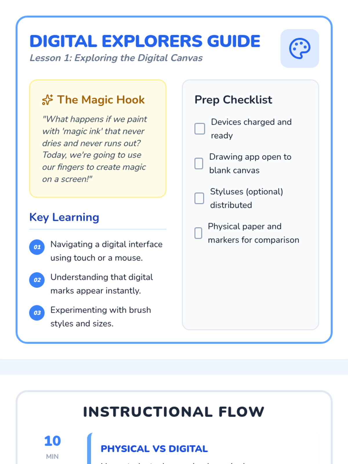 A foundational sequence for Kindergarten students to explore digital design tools, from basic brush strokes to creating a digital self-portrait. Students learn to navigate interfaces, use editing tools like 'undo', and understand the concept of saving digital work.