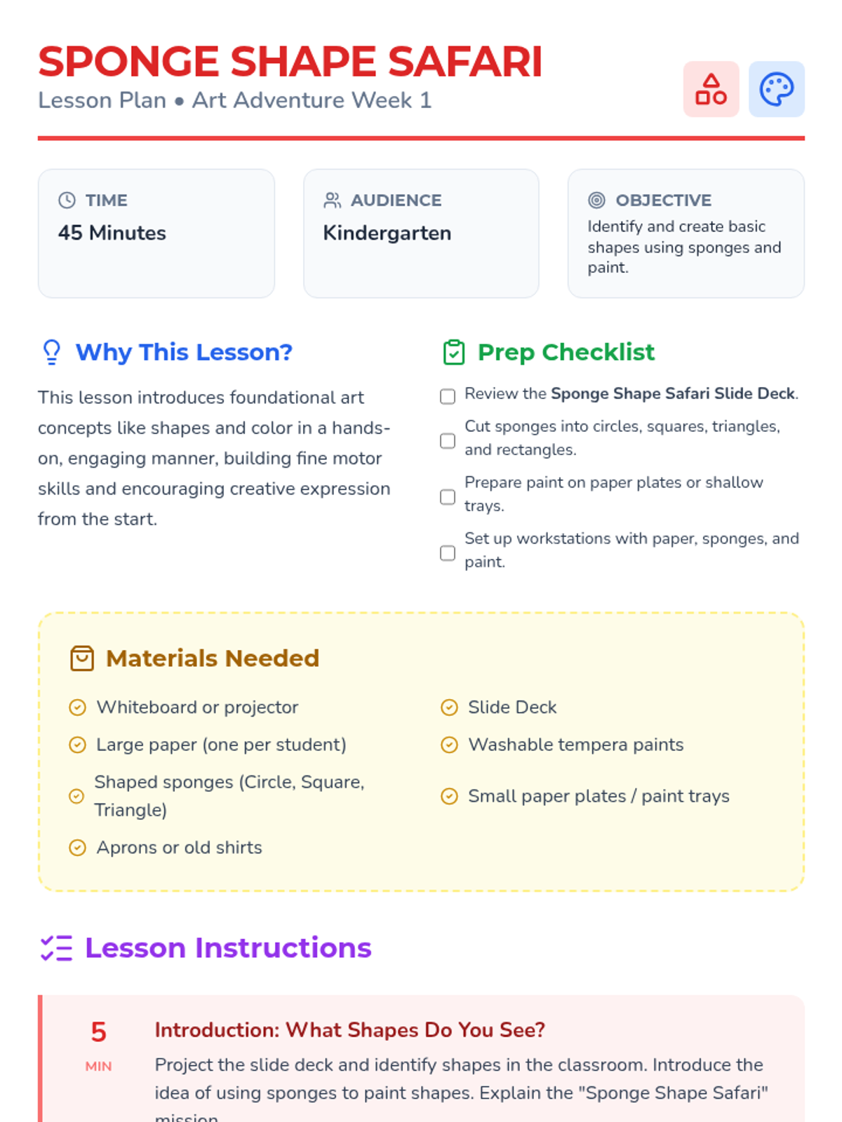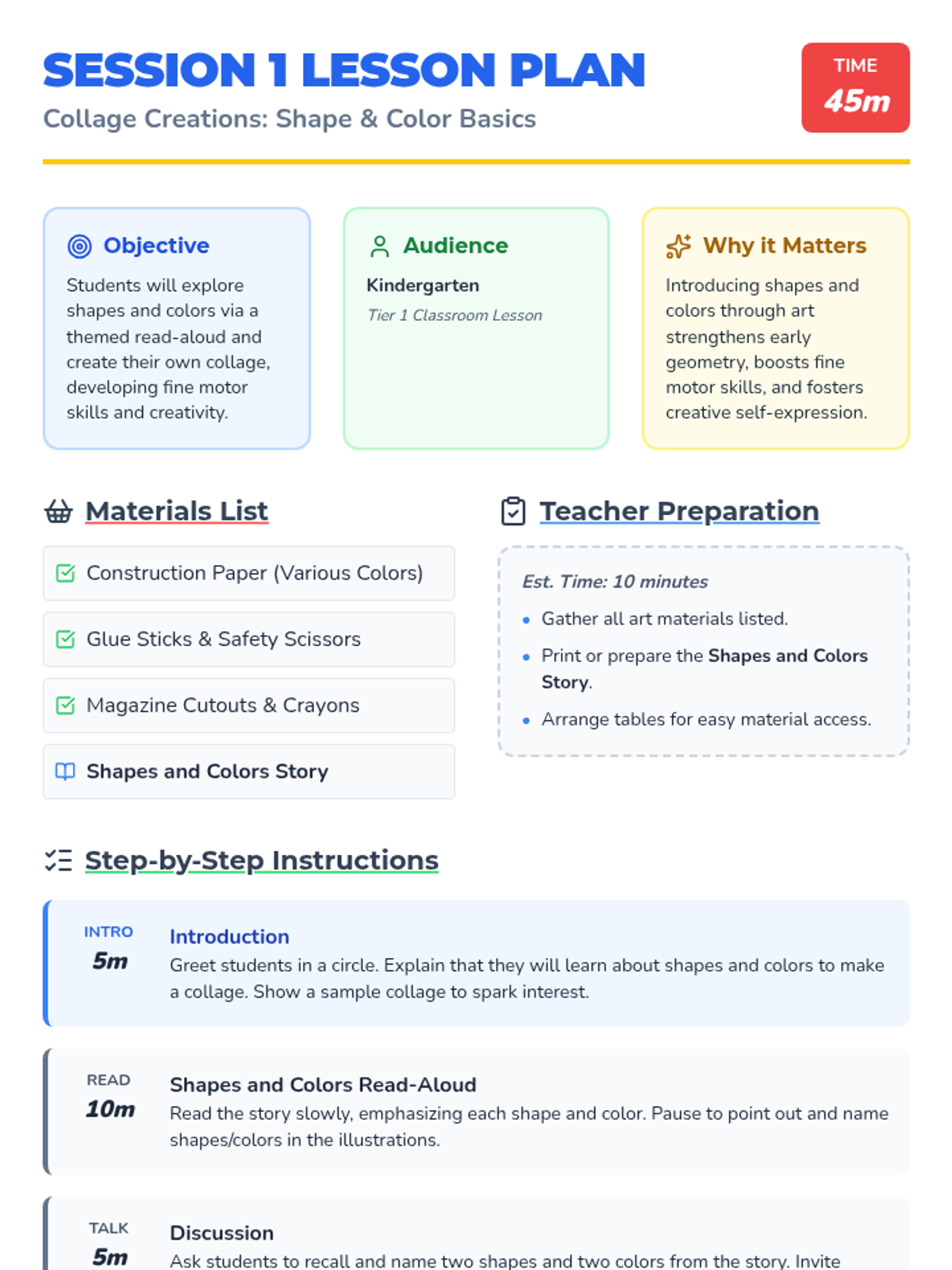 A two-session kindergarten art unit exploring shapes, colors, and textures through collage. Students develop fine motor skills and creative expression by layering everyday materials.