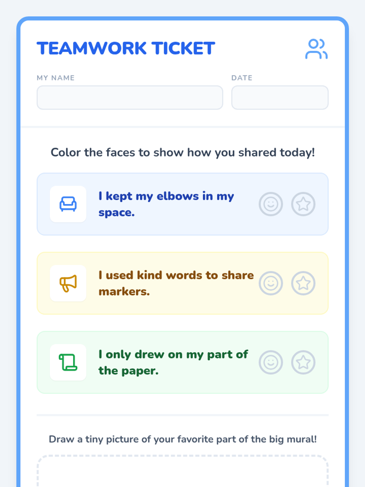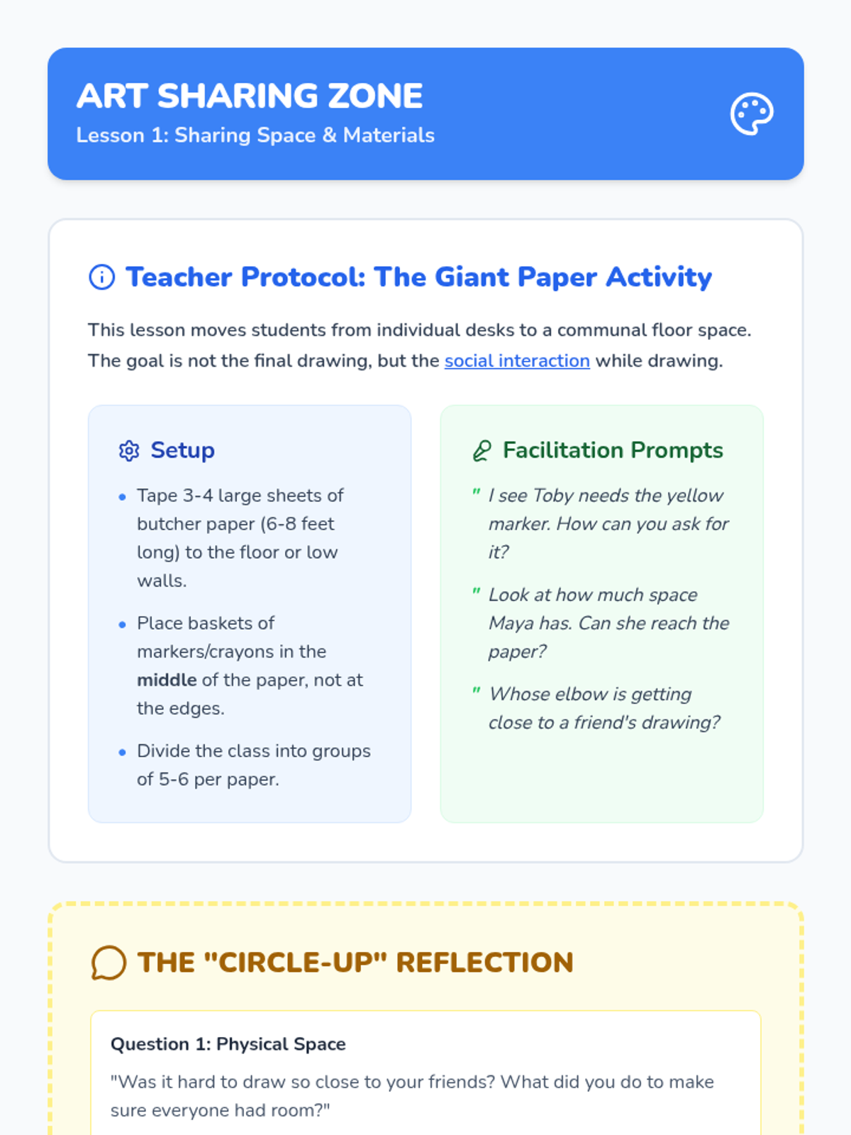 A Pre-K sequence focused on collaborative art-making, teaching students flexibility, shared ownership, and the joy of creating together. through 'pass-the-art' games and team projects.