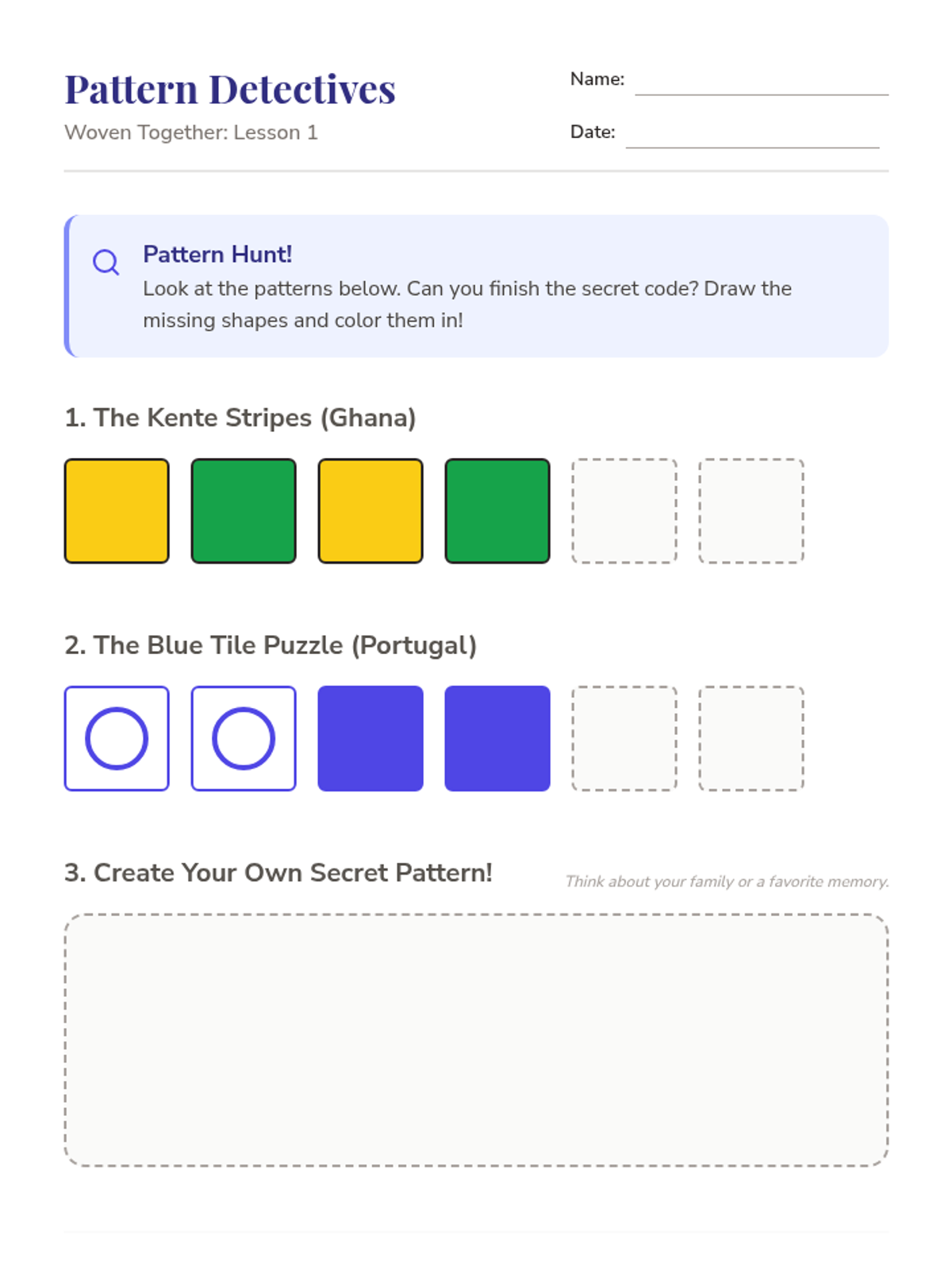 Students explore how art expresses culture, heritage, and identity through patterns, clothing, masks, and festival decorations, culminating in the creation of a personal family artifact.