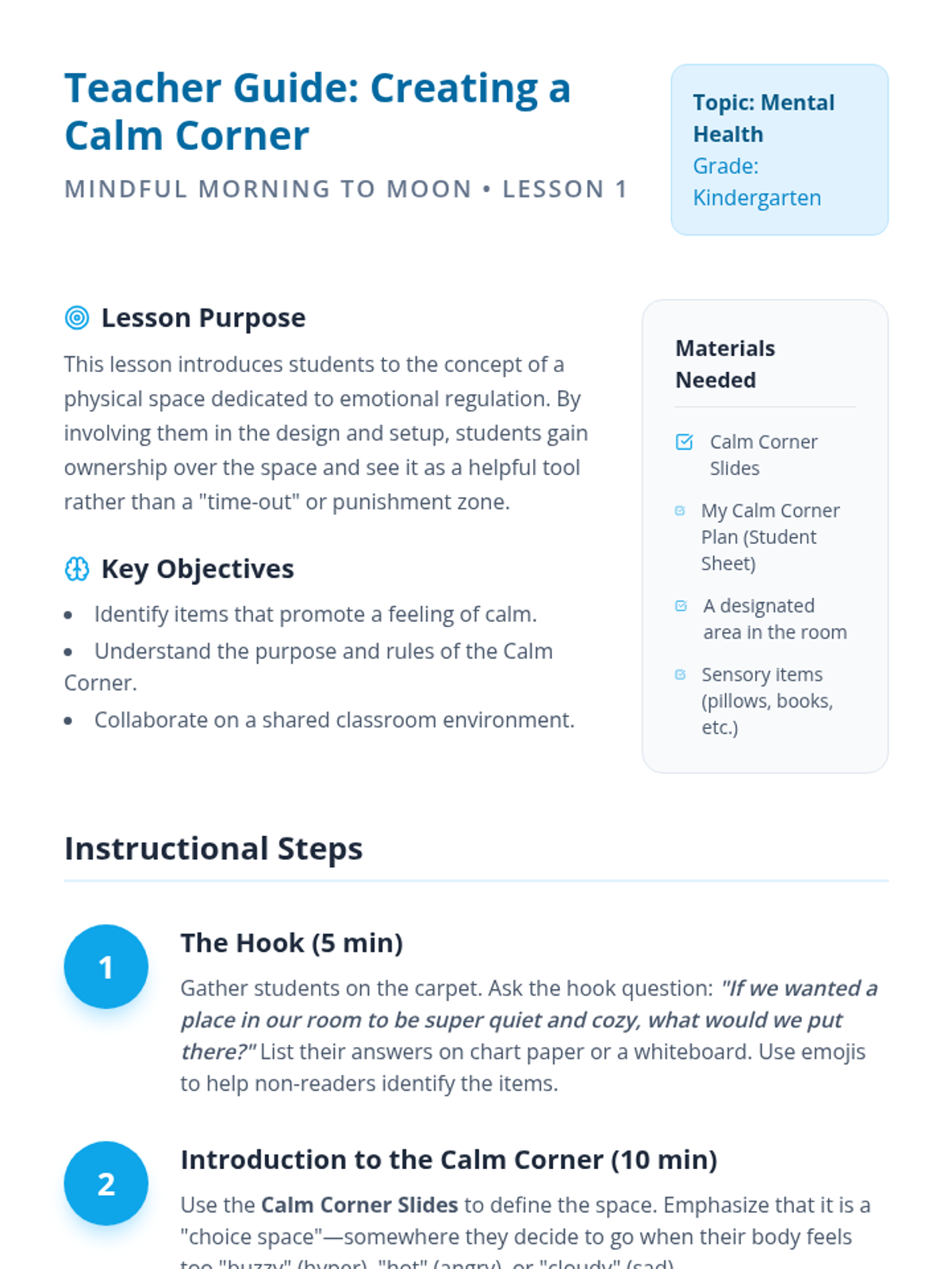 A Kindergarten sequence focused on building daily mindfulness routines and environments. Students learn to design calm spaces, practice morning and evening routines, and share their skills with others.