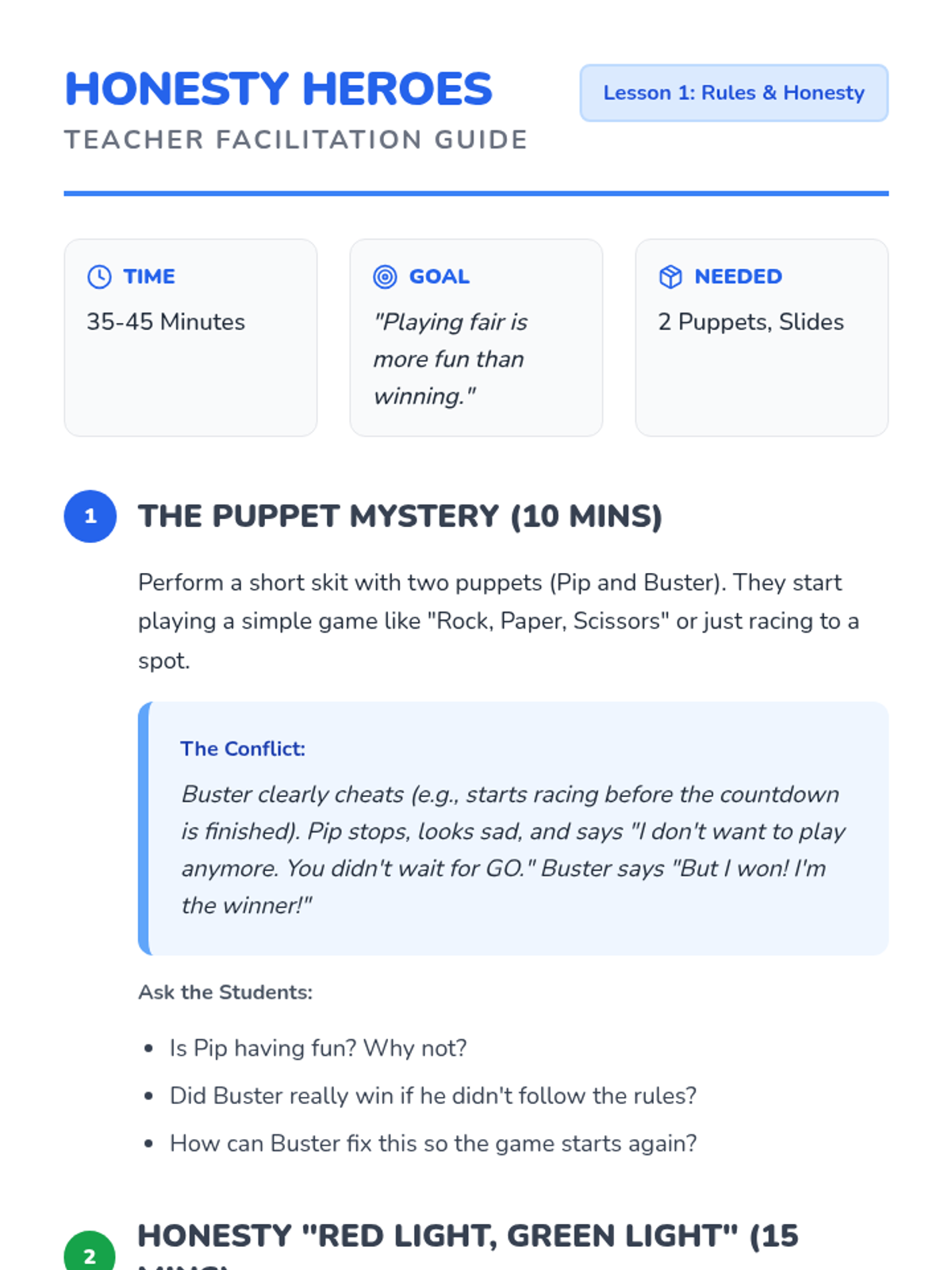 A 5-lesson sequence for Kindergarten students focused on developing sportsmanship, honesty, emotional regulation, and teamwork through active play. Students learn that being a kind friend and playing fairly is more important than winning.