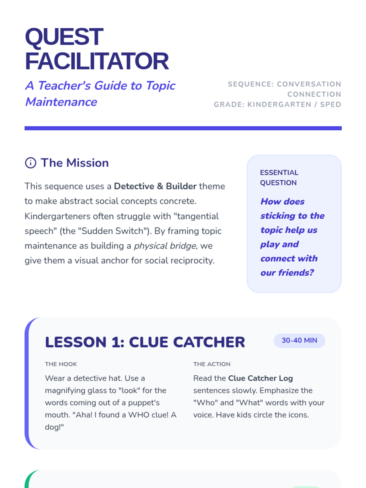 A Kindergarten social communication sequence focusing on topic maintenance. Students learn to listen for clues, build "connection bridges" between thoughts, ask on-topic questions, and transition politely using a detective and builder theme.