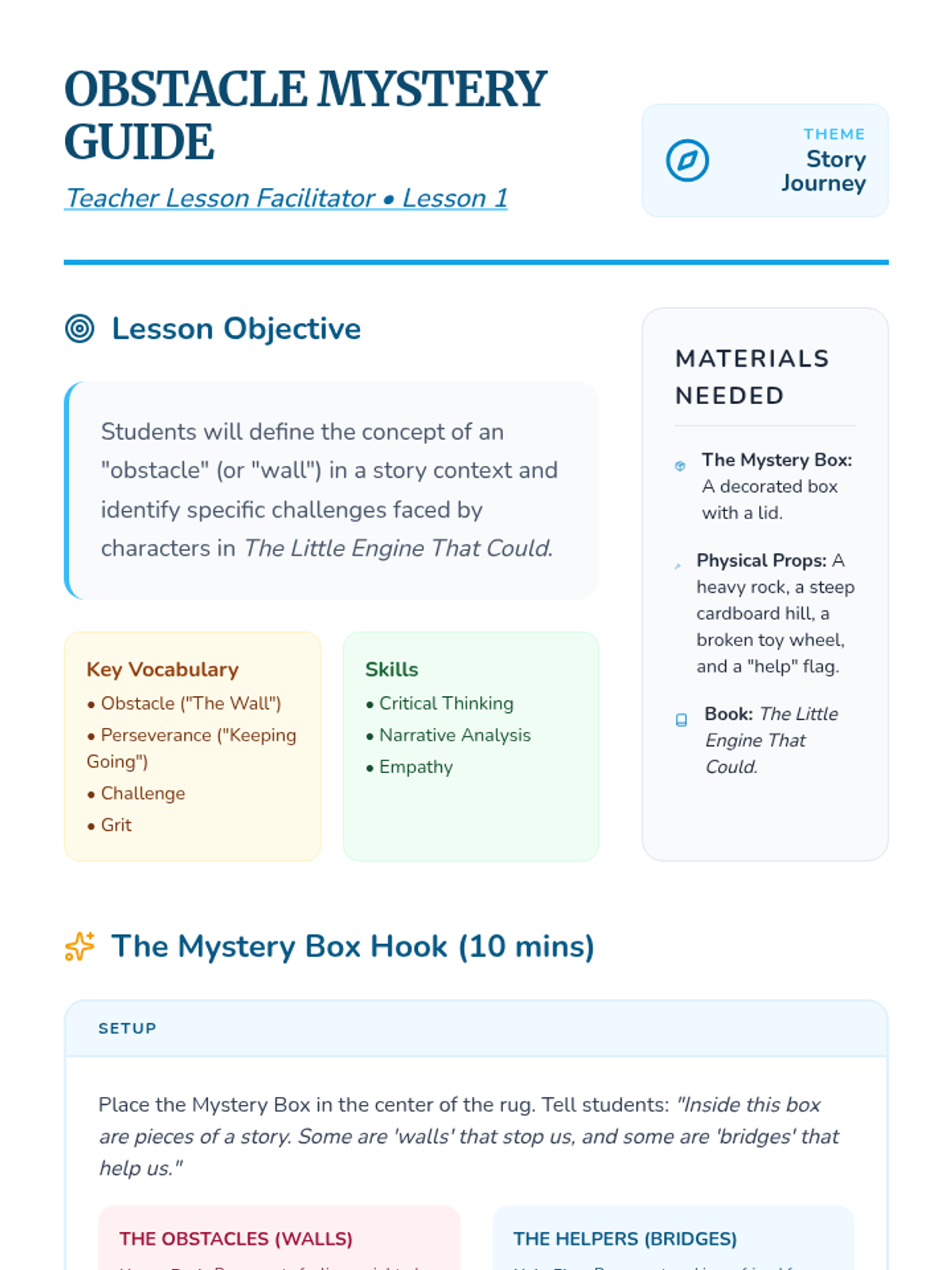 A Kindergarten sequence focused on building resilience and perseverance through storytelling, character analysis, and role-play. Students learn to identify obstacles, use positive self-talk, and recognize their own capacity to overcome challenges.