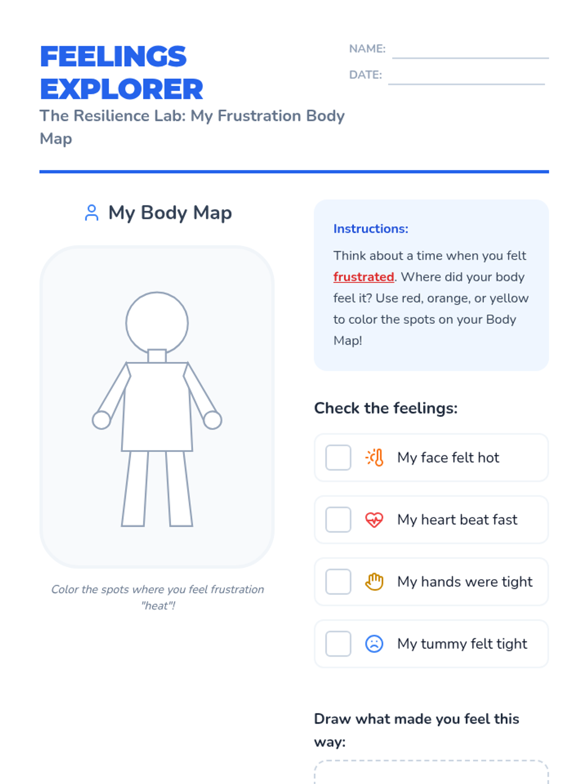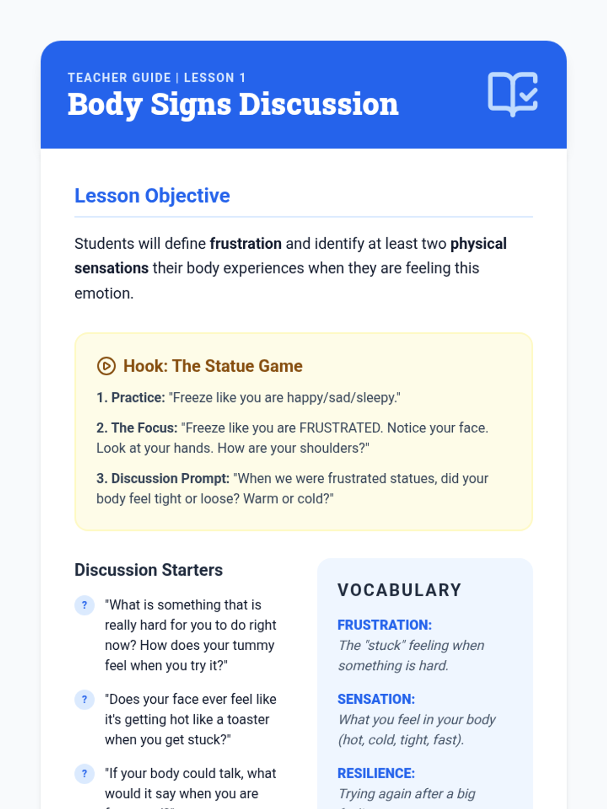 A Kindergarten sequence focused on somatic markers of frustration and emotional regulation techniques. Students learn to recognize body signs, practice breathing strategies, use the 'Stop, Name, Calm' algorithm, and coach peers through setbacks.