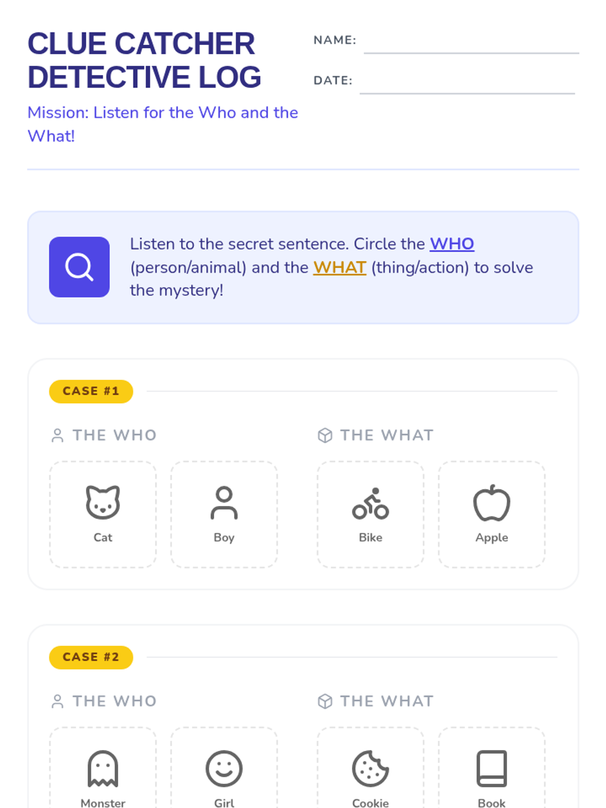 This sequence focuses on auditory processing and the cognitive strategy of verbal rehearsal (self-talk) to hold information in working memory. Students learn to 'catch' a verbal instruction, repeat it to themselves or a peer, and then execute it.