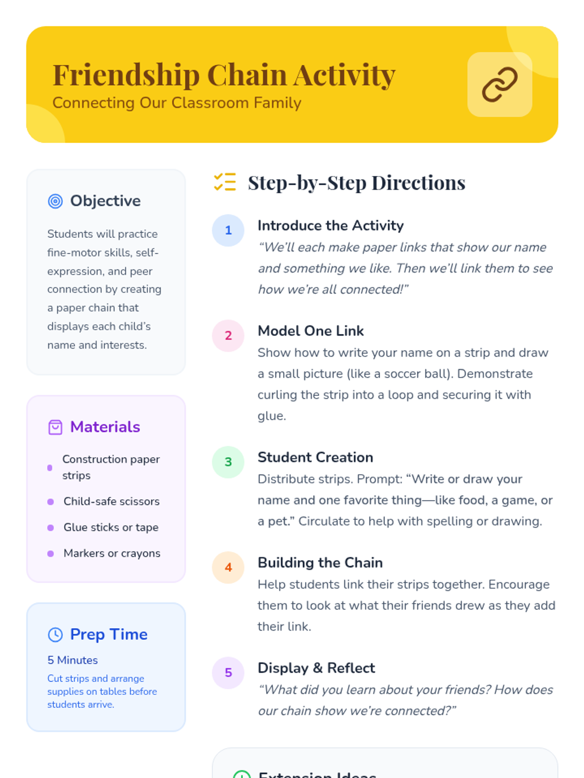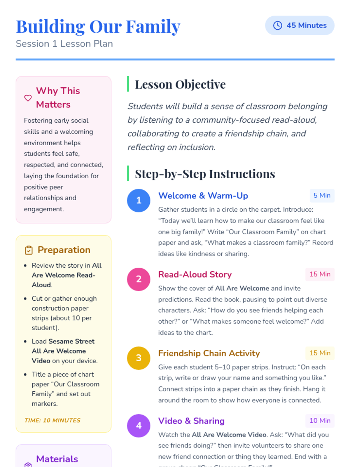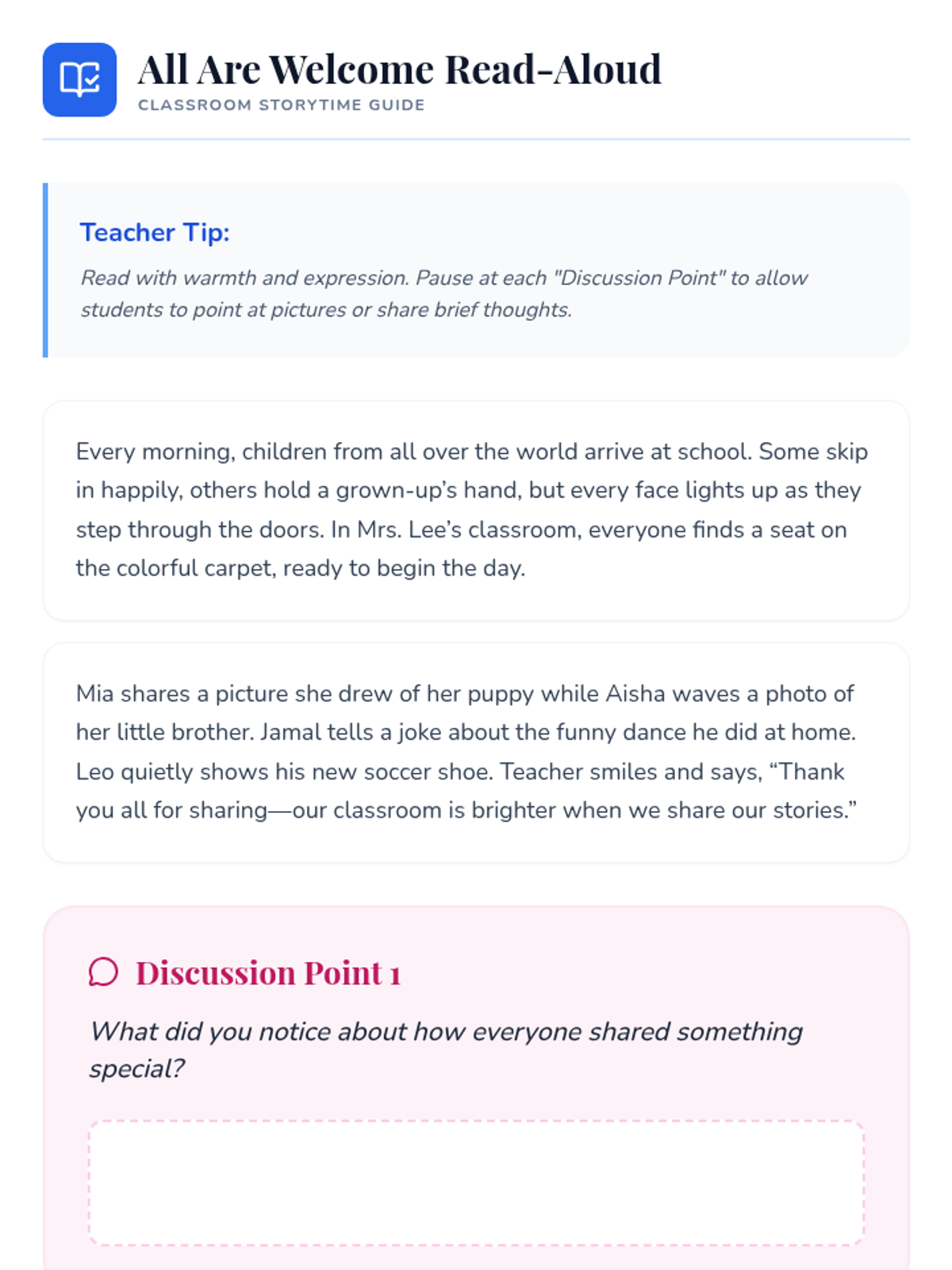 A five-day social-emotional learning sequence for elementary students exploring acceptance, diversity, and belonging through the story 'All Are Welcome Here'. Students build empathy and celebrate classroom community through discussion, reflection, and collaborative art.