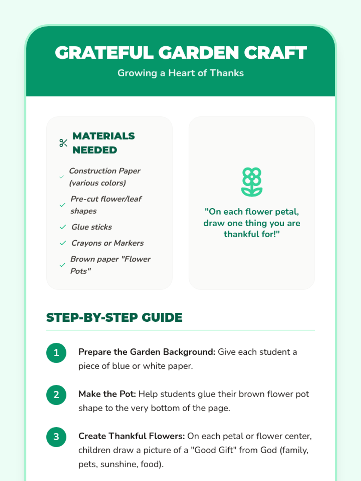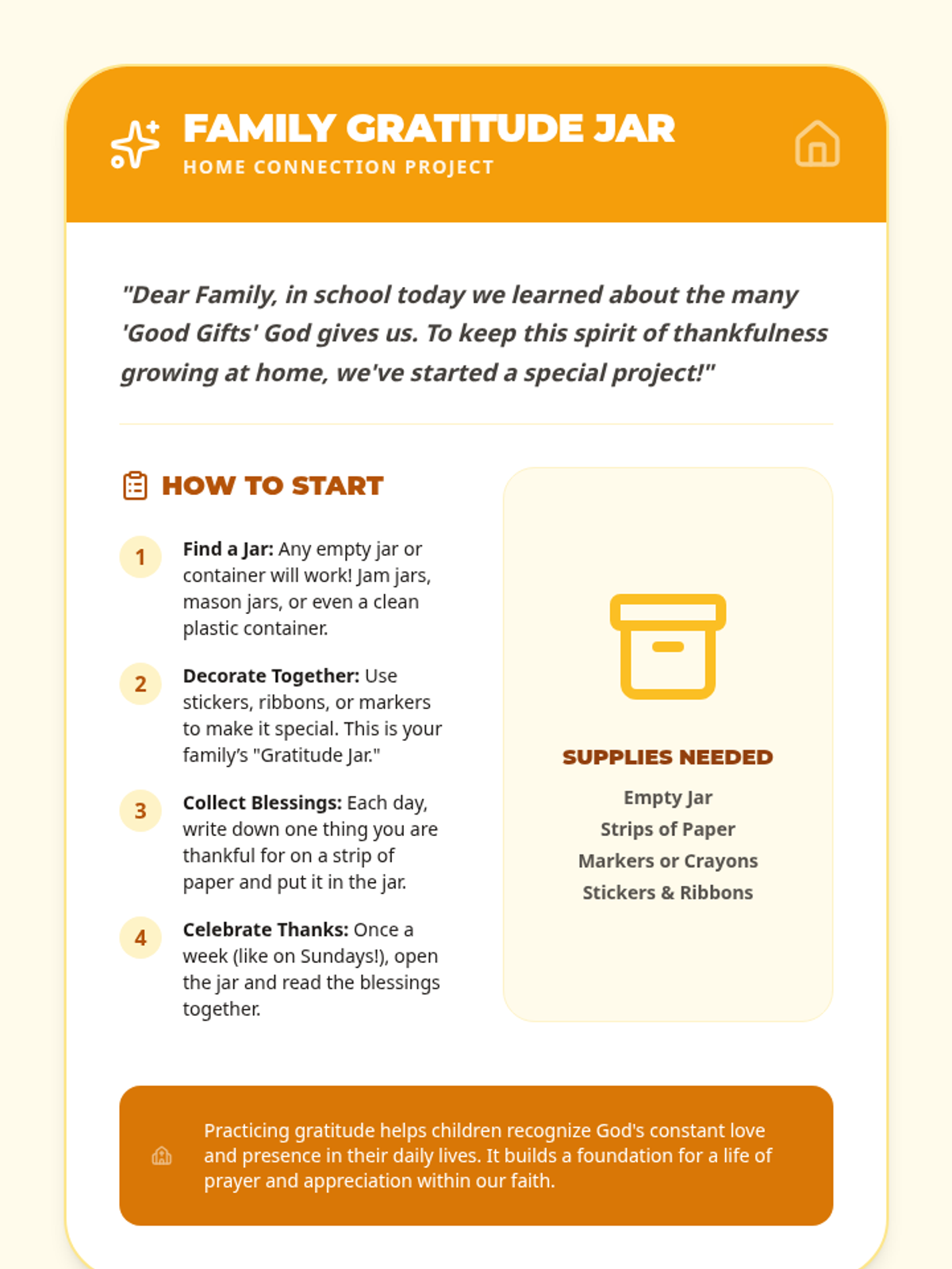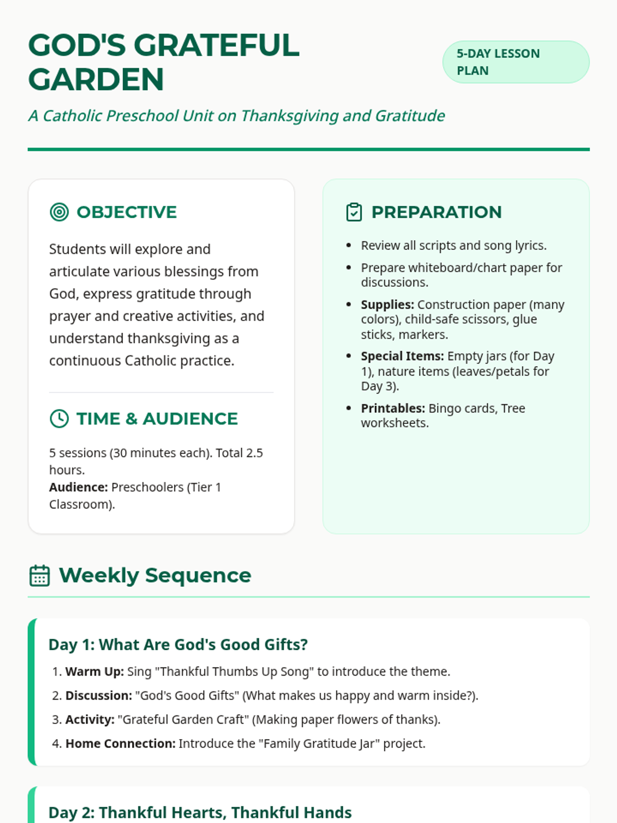 A 5-day Catholic preschool unit focused on gratitude, exploring God's gifts through songs, crafts, and interactive discussions. Students learn to recognize blessings in nature, family, and faith.