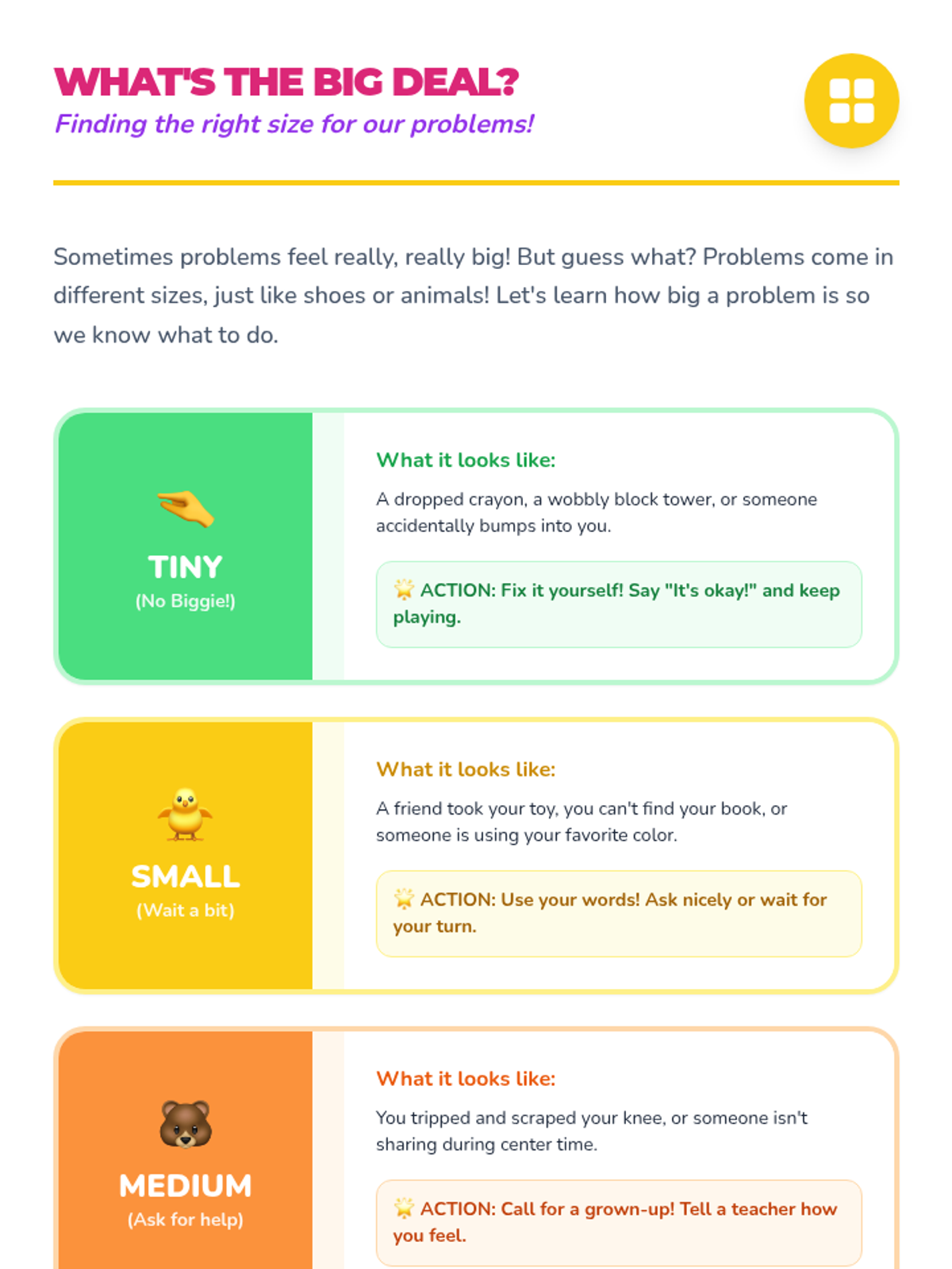 A Kindergarten sequence focused on recognizing dysregulation and seeking co-regulation from safe adults. Students learn to identify 'big feelings' in others and themselves, use non-verbal signals for help, and practice calming techniques to safely return to classroom activities.