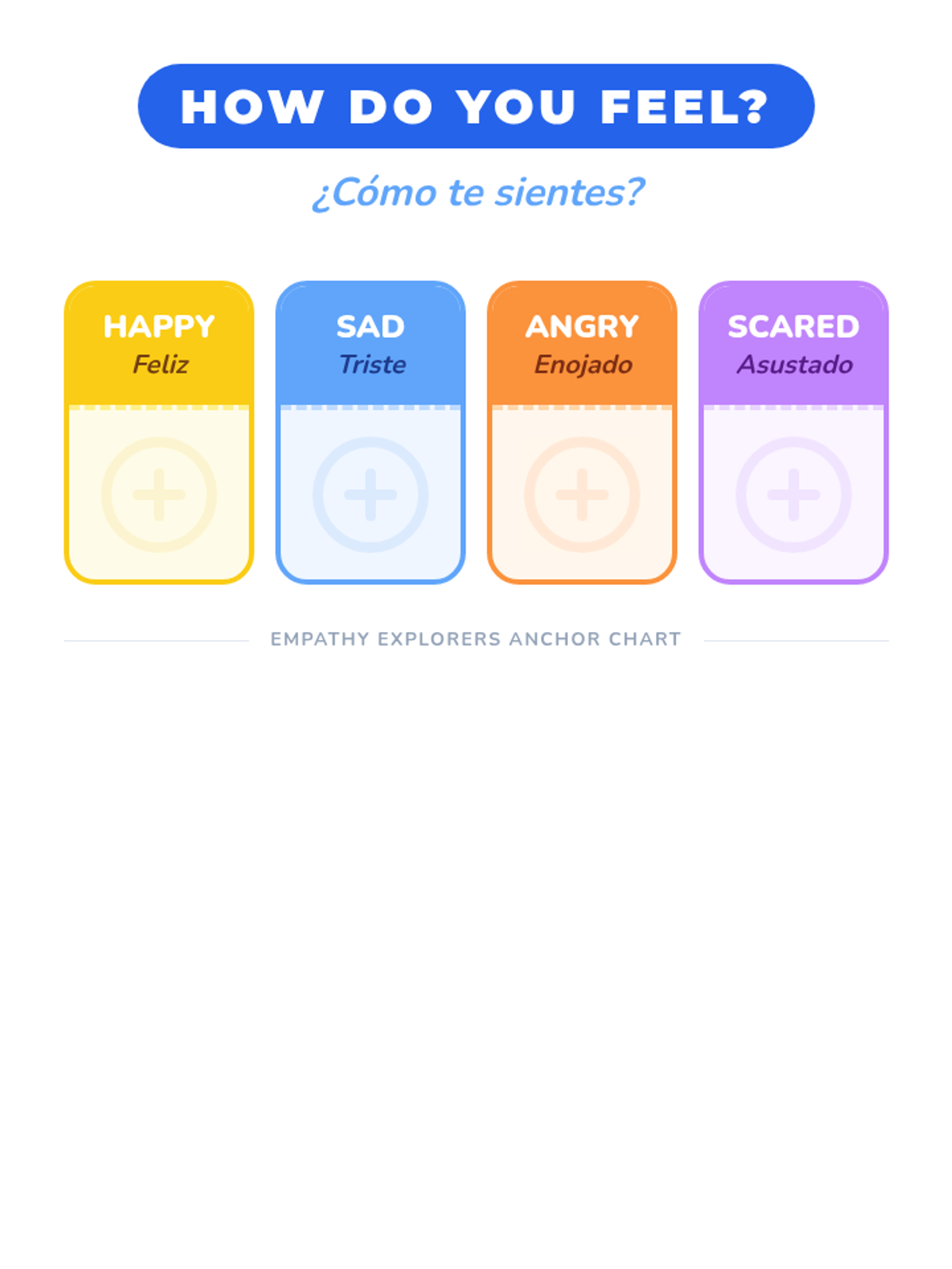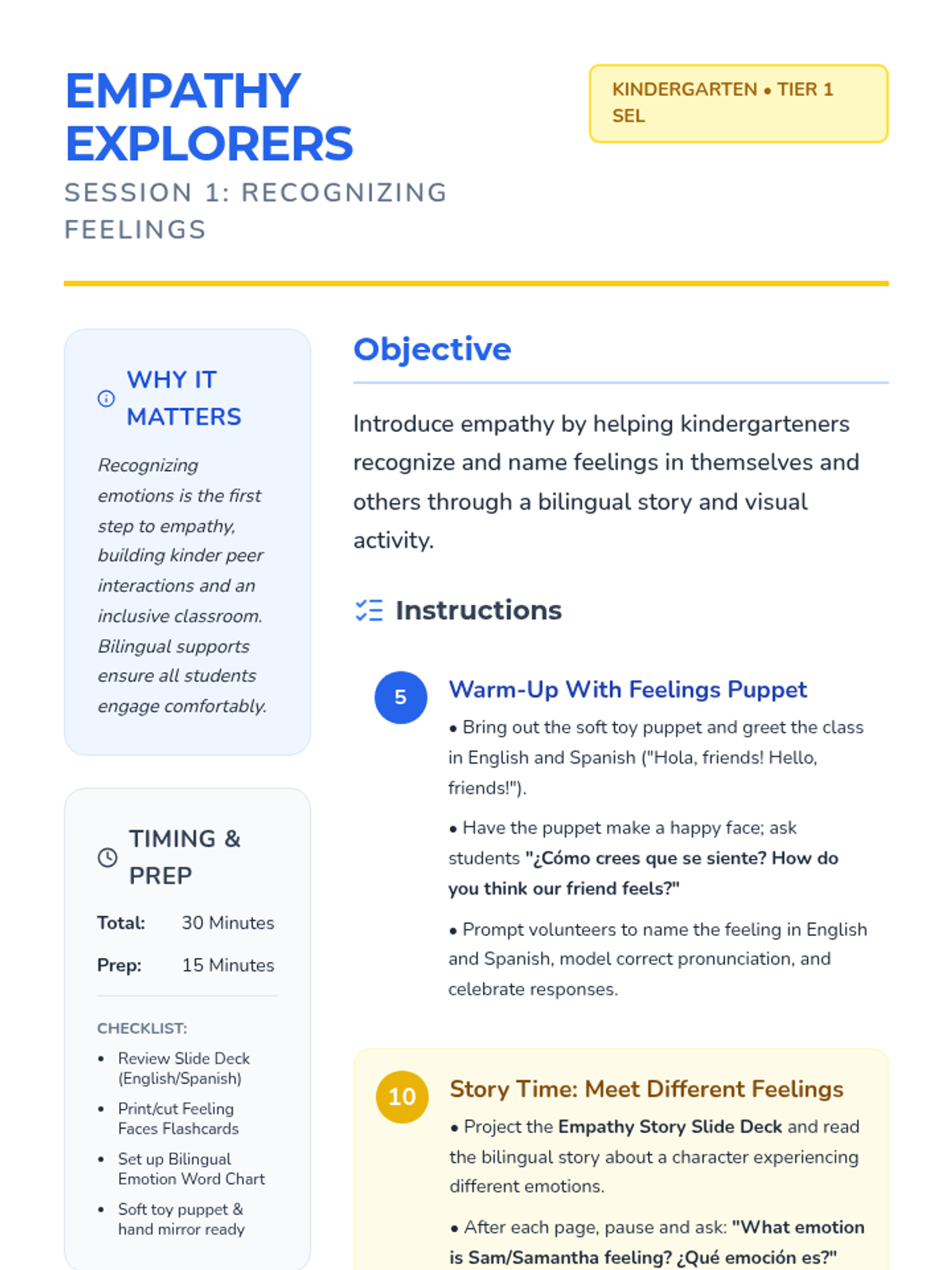 A 2-session Tier 1 SEL series for kindergarteners focused on empathy, emotion recognition, and bilingual support (English/Spanish). Students learn to name and respond to feelings in themselves and others.