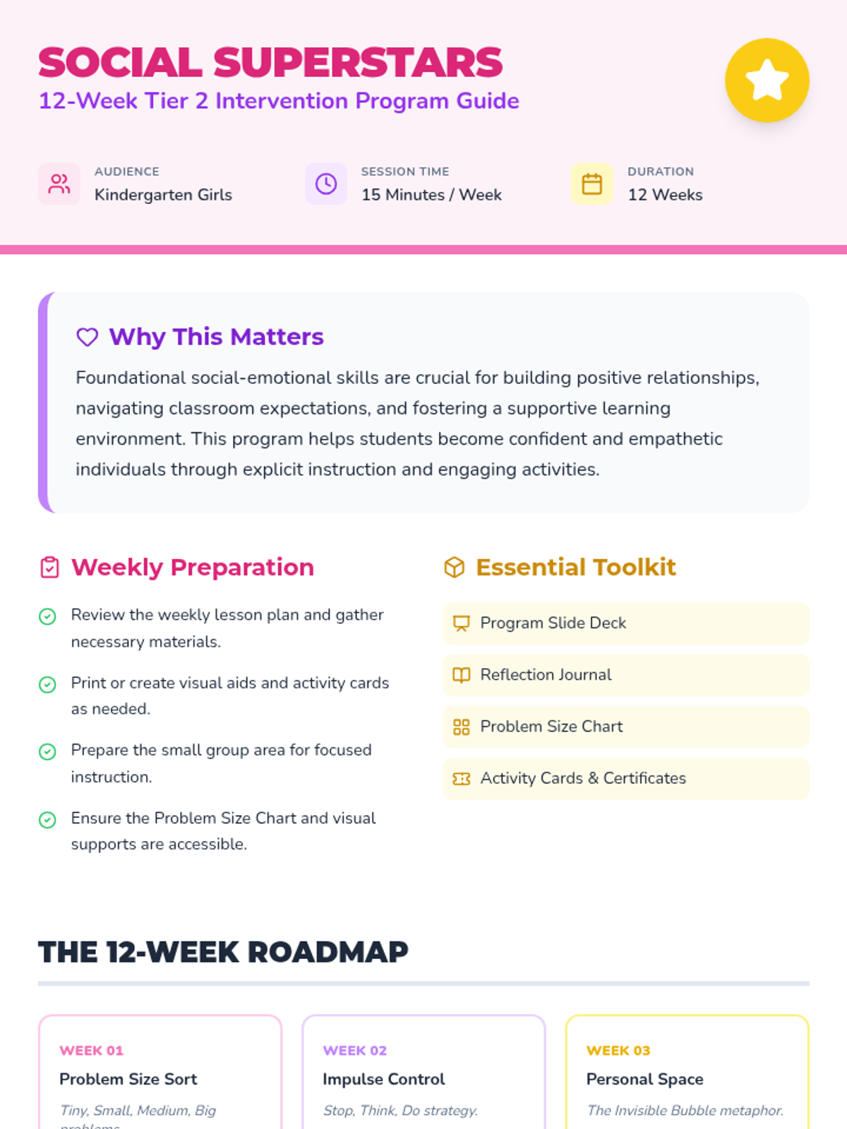 A 12-week Tier 2 intervention program for Kindergarten girls to develop foundational social-emotional skills like problem-solving, impulse control, and self-awareness.