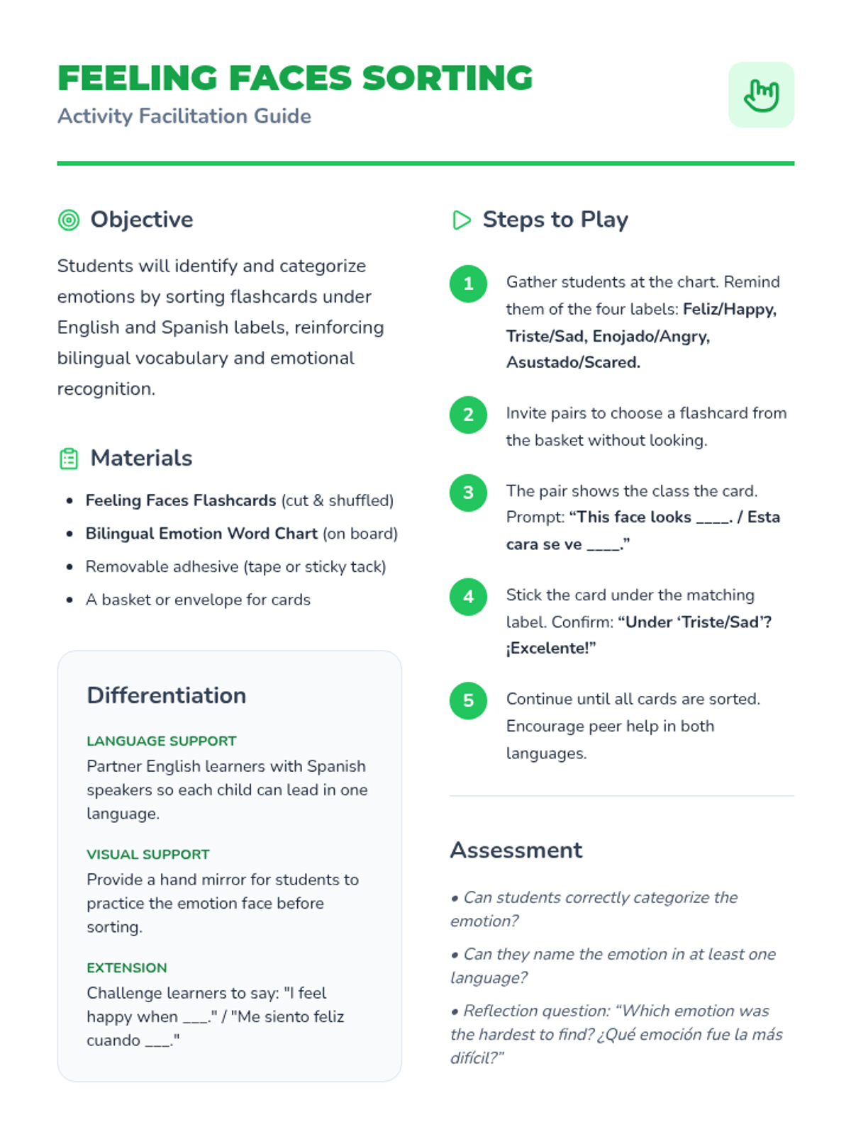 A game-based social communication sequence for Pre-K students to differentiate between greetings for peers (friends) and adults (teachers/parents). Through sorting, movement, and roleplay, students build the foundational skills needed for context-appropriate social interactions.