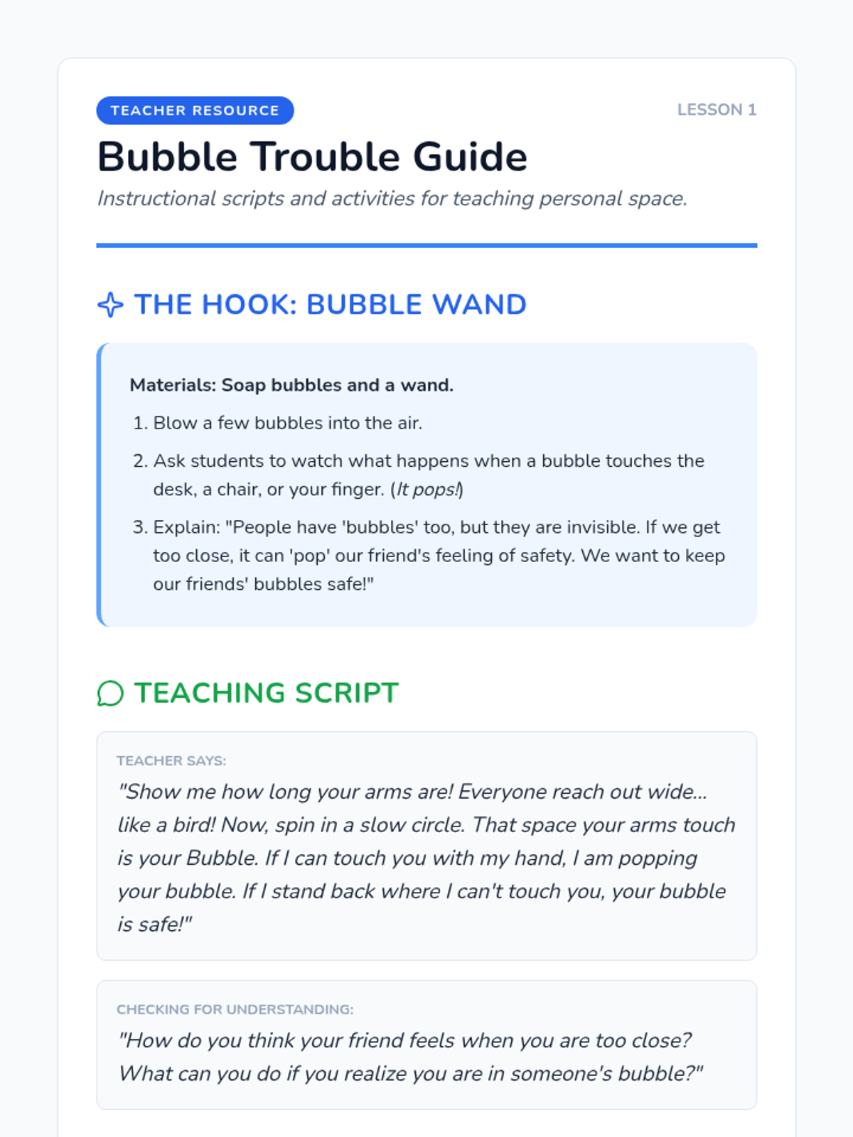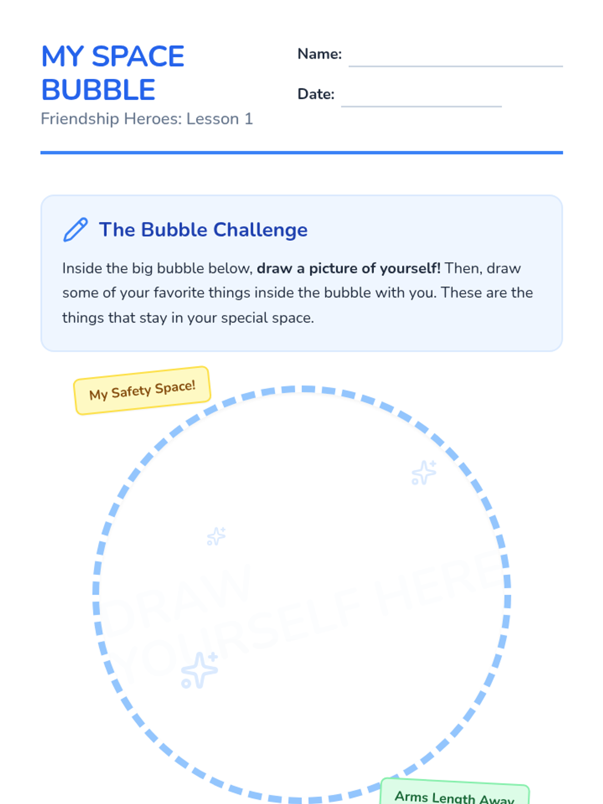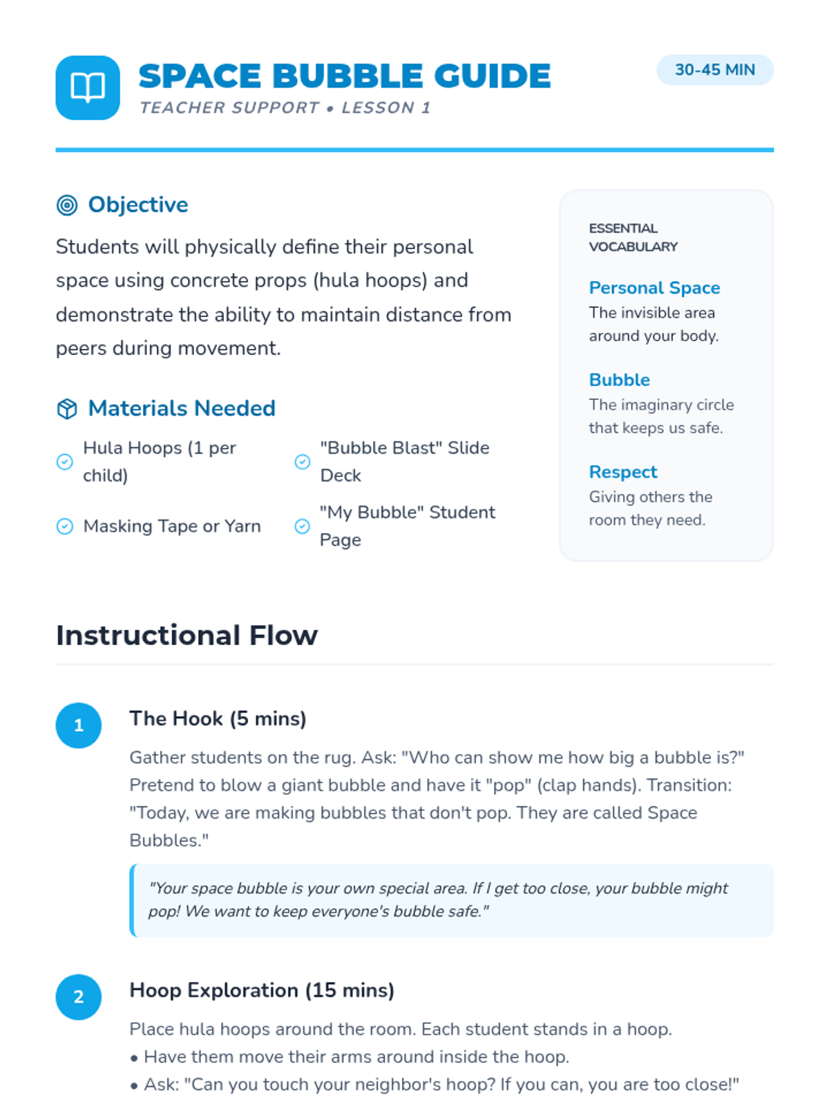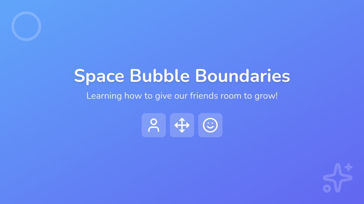 A game-based sequence for Kindergarten students to learn and respect personal space boundaries through physical movement and visualization. Students progress from using physical props to internalizing social cues for navigating shared spaces.