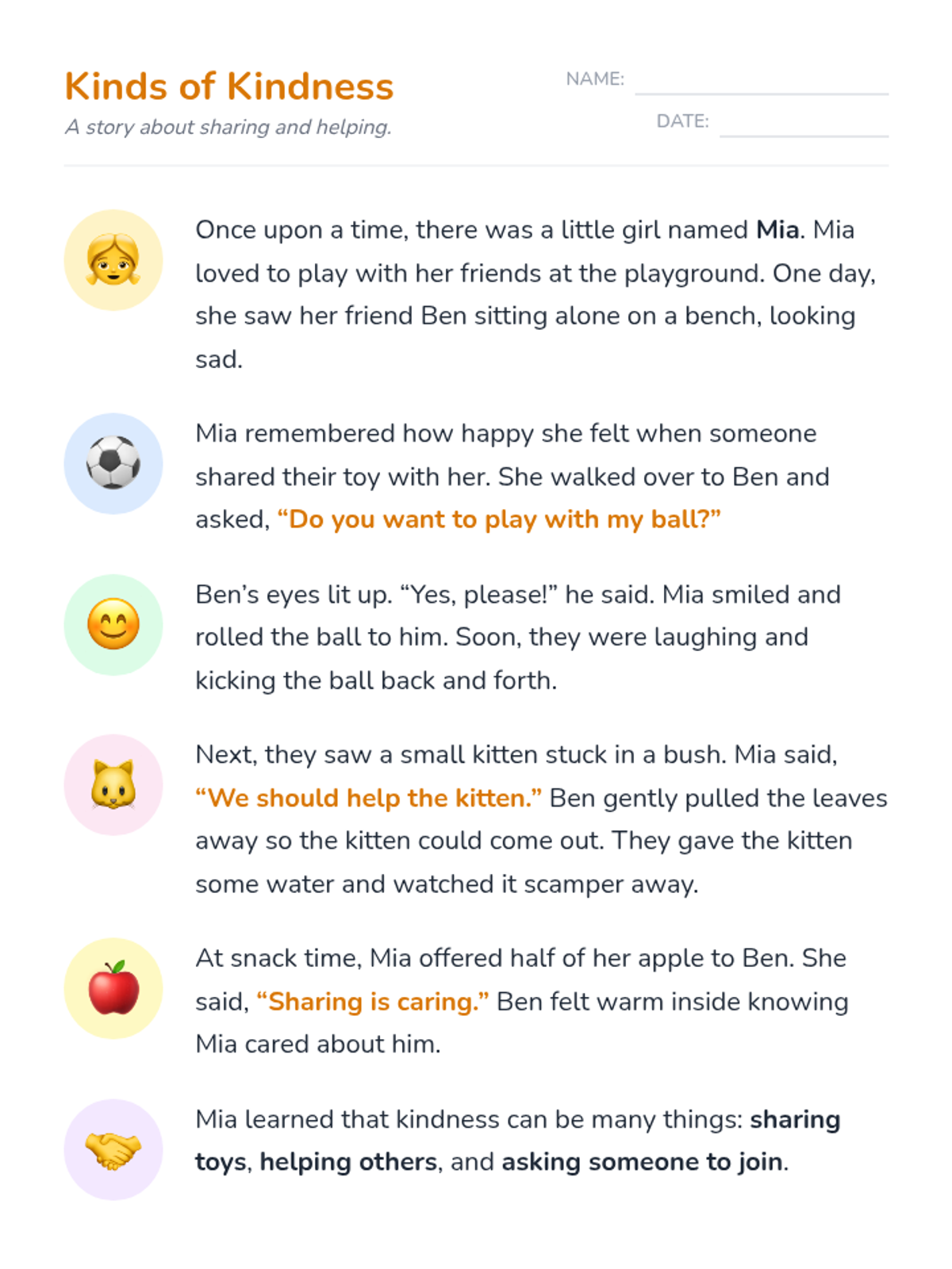 A Kindergarten sequence focused on social-emotional learning through social stories, helping students navigate personal space, joining play, turn-taking, sportsmanship, and sharing.