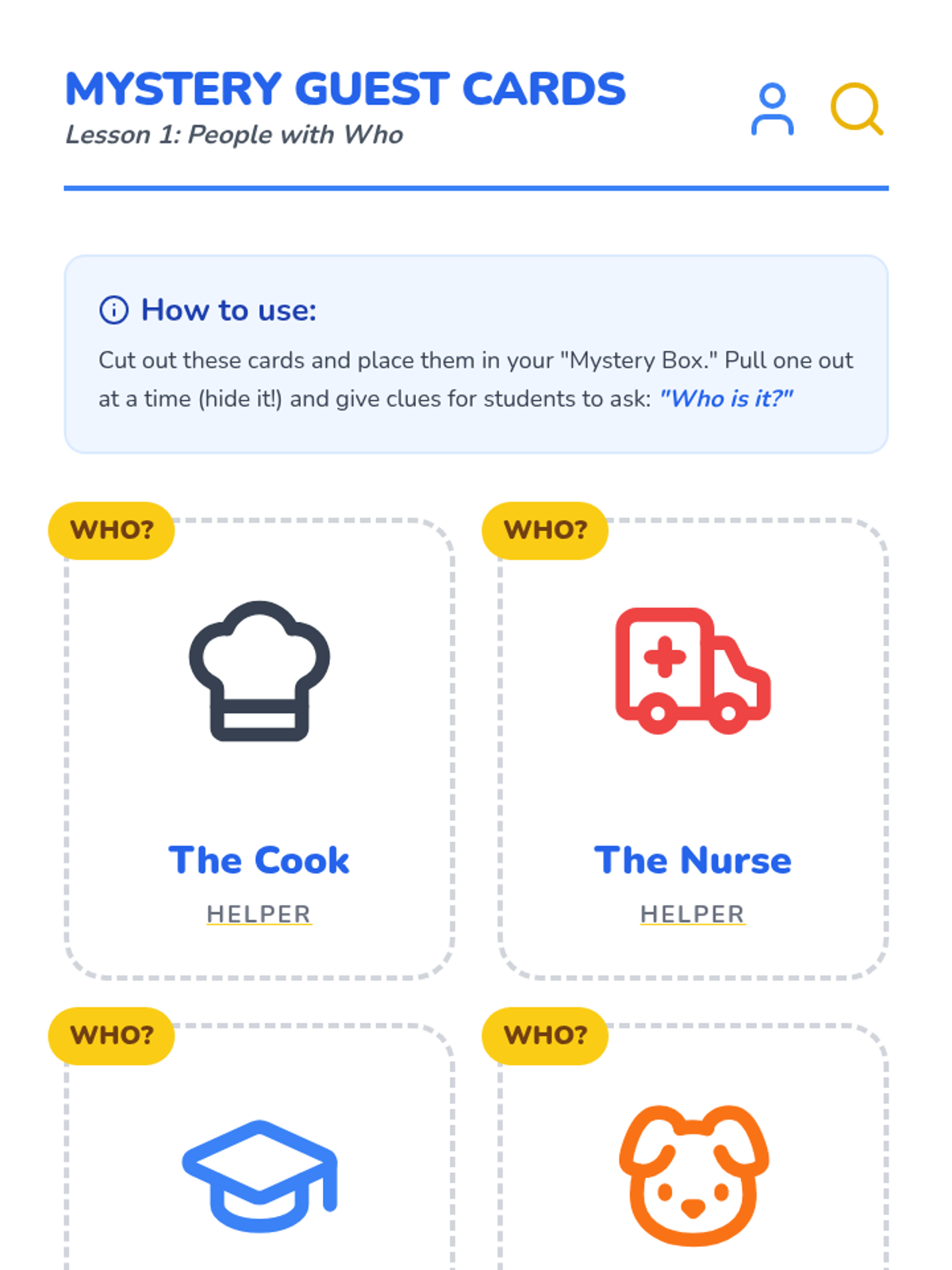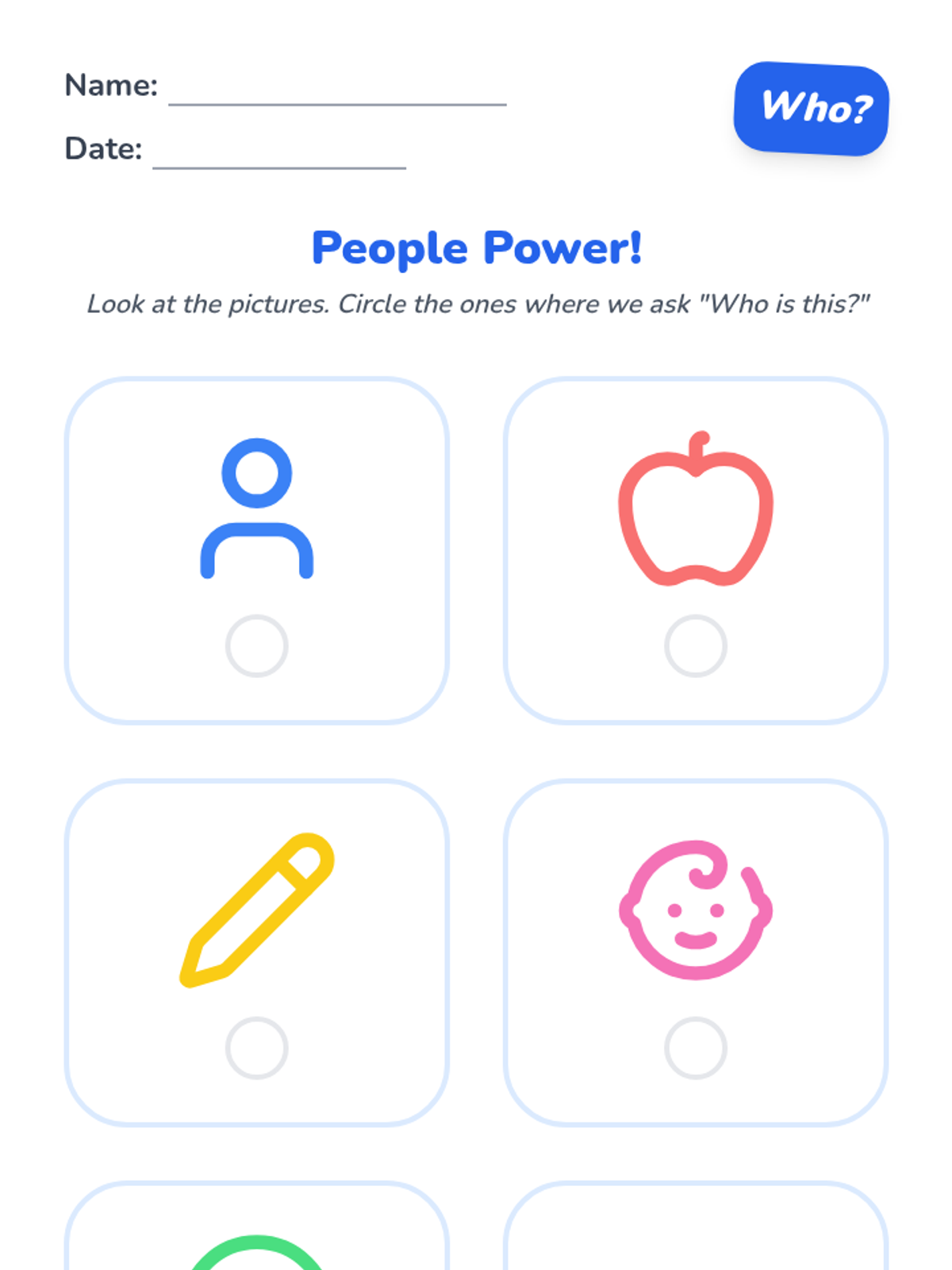 This sequence introduces Pre-K students to 'Who' and 'What' through interactive play, sorting, and dialogue, helping them distinguish between people and objects.